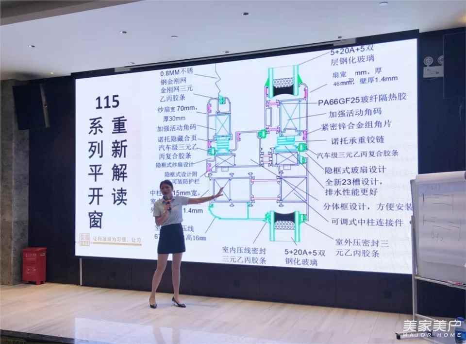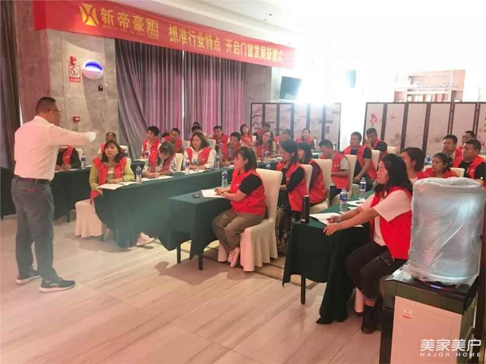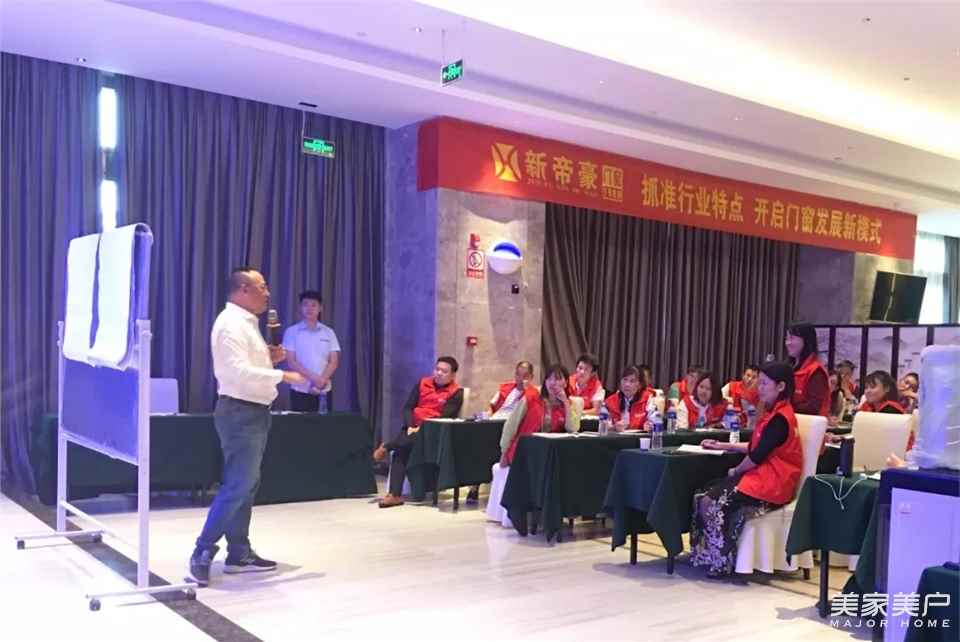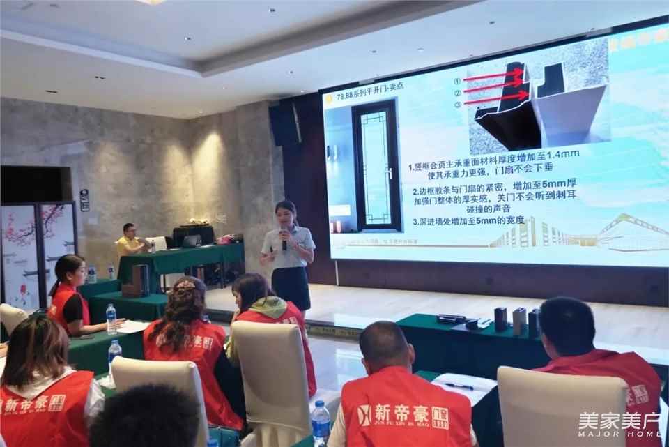 会议上,拥有多年门窗经验的新帝豪市场运营部培训讲师针对新款的门、窗产品进行《产品专业知识课程培》培训,现场讲解产品优势、卖点,并对3.0超重型网红推拉门的相关疑问、话术进行了解答。