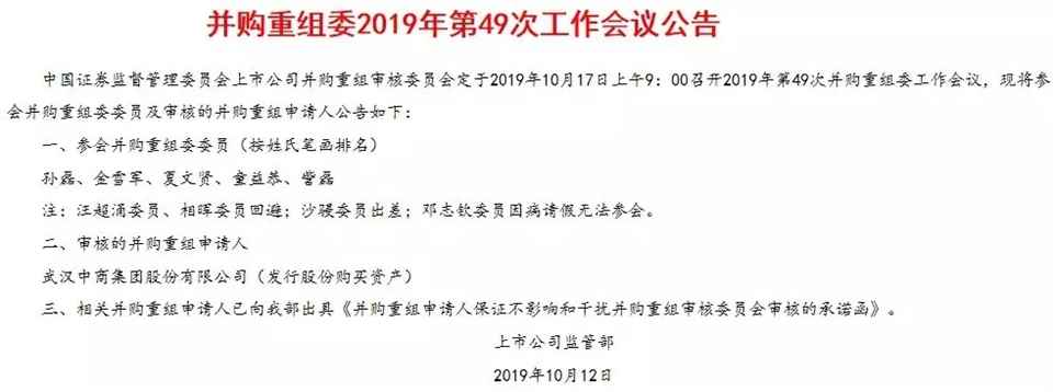 上周六(10月12日),证监会并购重组委2019年第49次工作会议公告,上市公司并购重组审核委员会定于2019年10月17日上午9:00召开2019年第49次并购重组委工作会议,审核的并购重组申请人为“武汉中商集团股份有限公司(发行股份购买资产)”。