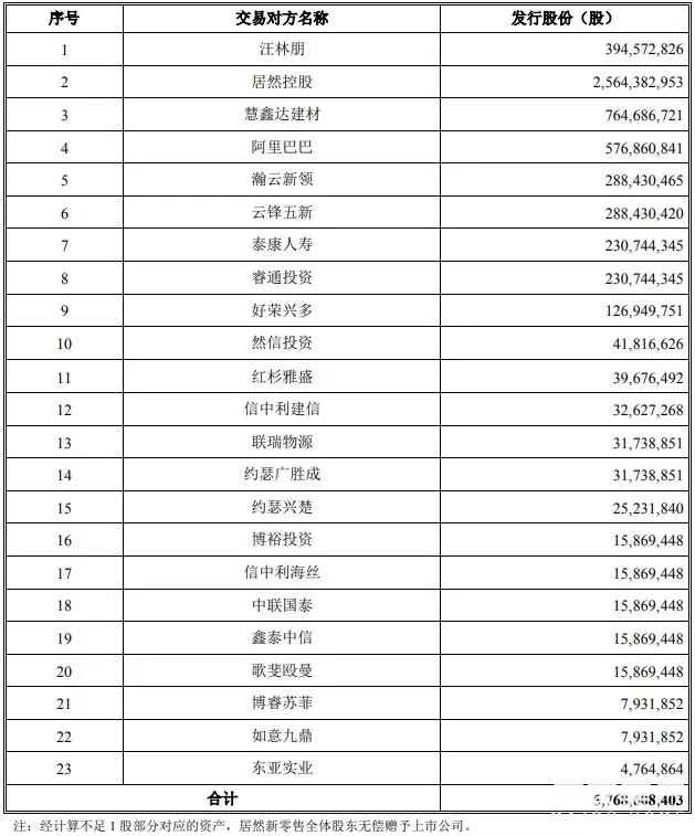 3、本次交易拟购买资产作价3565000.00万元,按照本次发行股票价格6.18元/股计算,本次拟发行的A股股票数量为5768608403股,上市公司向居然控股等23名交易对方发行股份的具体数量如下表: