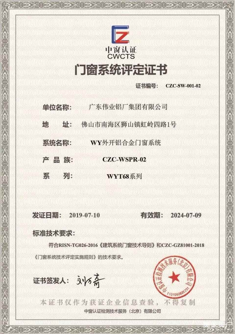 通过认证的产品分别为:WYT68系列WY外开铝合金门窗系统和 WYT78系列WY内开铝合金门窗系统。