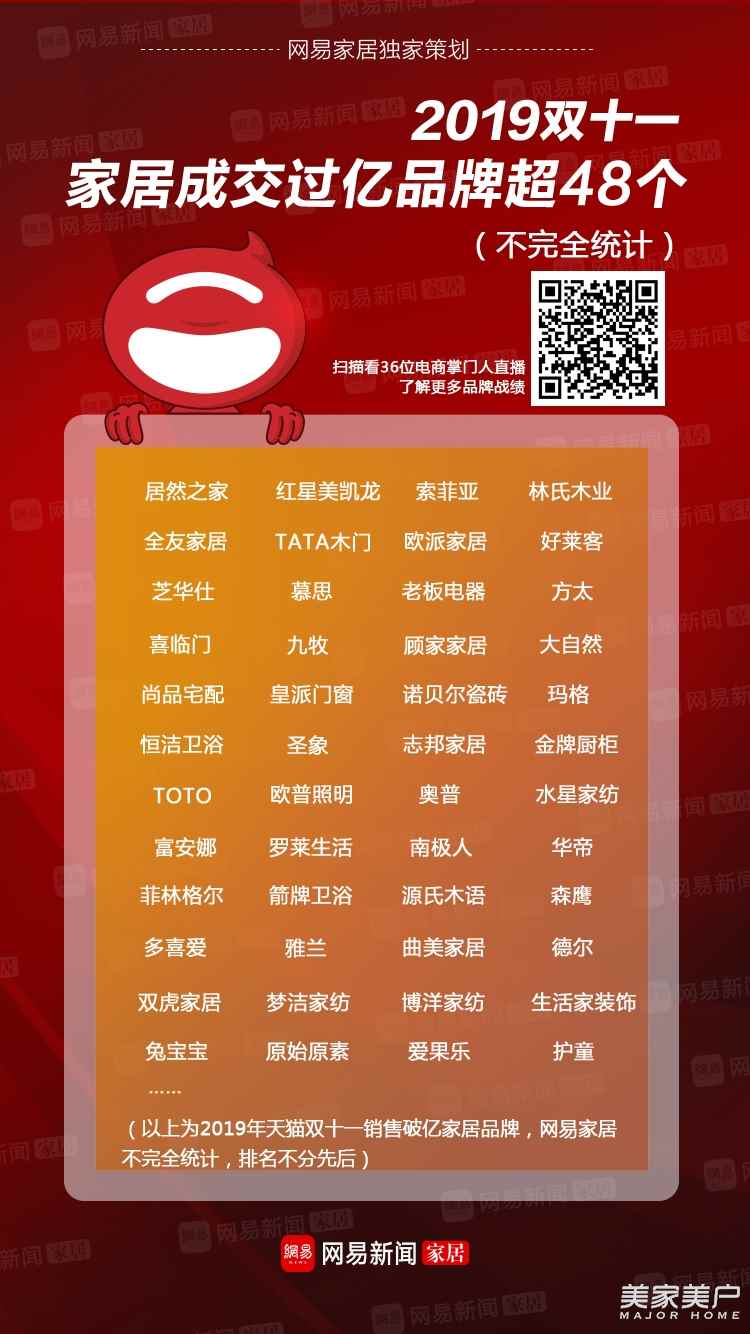 据网易家居不完全统计:居然之家、红星美凯龙、索菲亚、林氏木业、全友家居、TATA木门、欧派家居、好莱客、芝华仕、慕思、老板电器、方太、喜临门、九牧、顾家家居、大自然、尚品宅配、皇派门窗、诺贝尔瓷砖、玛格、恒洁卫浴、圣象、志邦家居、金牌厨柜、TOTO、欧普照明、奥普、水星家纺、富安娜、罗莱生活、南极人、华帝、菲林格尔、箭牌卫浴、源氏木语、森鹰、多喜爱、雅兰、曲美家居、德尔地板、双虎家居、梦洁家纺、博洋家纺、生活家装饰、兔宝宝、原始原素、爱果乐、护童(排名不分先后)等超过48家品牌实现单日成交额过亿,成功登陆“亿元俱乐部”。