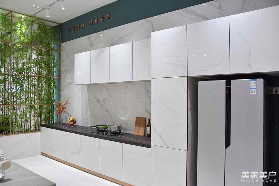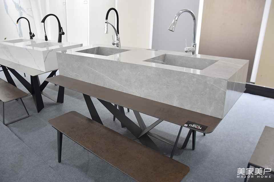 岩板在家具里面应用得非常的广泛,因为岩板表面非常的光滑,清晰的大理石纹路,在整体的装饰视觉效果上非常好。无论是办公室、高档酒店还是家庭装饰都彰显大气、优雅。而关伟镜根据岩板的规格和厚度来搭配不同的家具应用。据关伟镜介绍,目前德嘉国际家居岩板材料可以做到3米6高×1米6、 3米2×1米6、2米6×1米2、2米6×80、还有1米8的和1米5规格的搭配,材料厚度可以做到3厘、6厘、9厘、12厘、15厘还有20厘的岩板材料。不同的厚度搭配不用的家具运用,3厘厚度的岩板可以粘贴在一些材料上面去来进行结合使用,这种运用在橱柜门板上比较多;6厘厚度岩板的运用就比较广泛,它可以运用在门板、背景墙、餐桌,以及整个墙身的贴合运用,也是目前市场上需求比较大的岩板厚度;9厘厚度的岩板一般是运用在铺地和背景上面;12厘厚度的岩板一般是运用在橱柜和卫浴柜上面,因为岩板承受力可以完全的支撑卫浴柜的压力;15厘厚度的岩板也是运用量比较大的,它可以运用在橱柜上面的台面板,也可以运用到地面代替大理石的干挂、楼梯的铺贴等等,因为岩板不怕腐蚀的特性,也可以运用在外立面一些干挂;20厘米的岩板目前运用就很少,当然它运用主要还是在台面上,但是相对来说就没那么广泛,如果有些人要求比较高,想要台面做到两公分也有,但是这种要求的并不是太多。