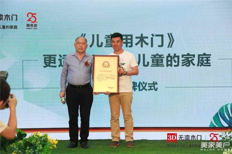 中国林产工业协会秘书长石峰为3D无漆木门颁发“适合0~6岁儿童房”产品鉴定证书