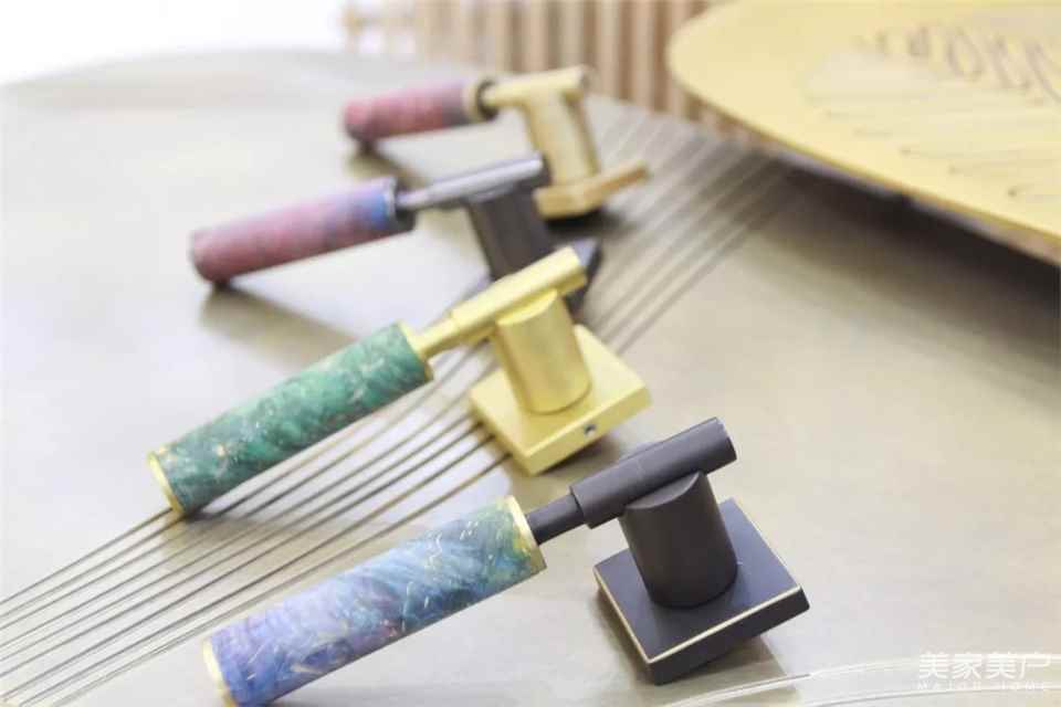 手柄原材料是稳定木(精度高,稳定),通过真空复压、抽取水分,再灌注颜色,形成了一副抽象的画作。而锁具的设计则是融合了东方文化,方方正正,正是中国自古崇尚的一种文化符号。