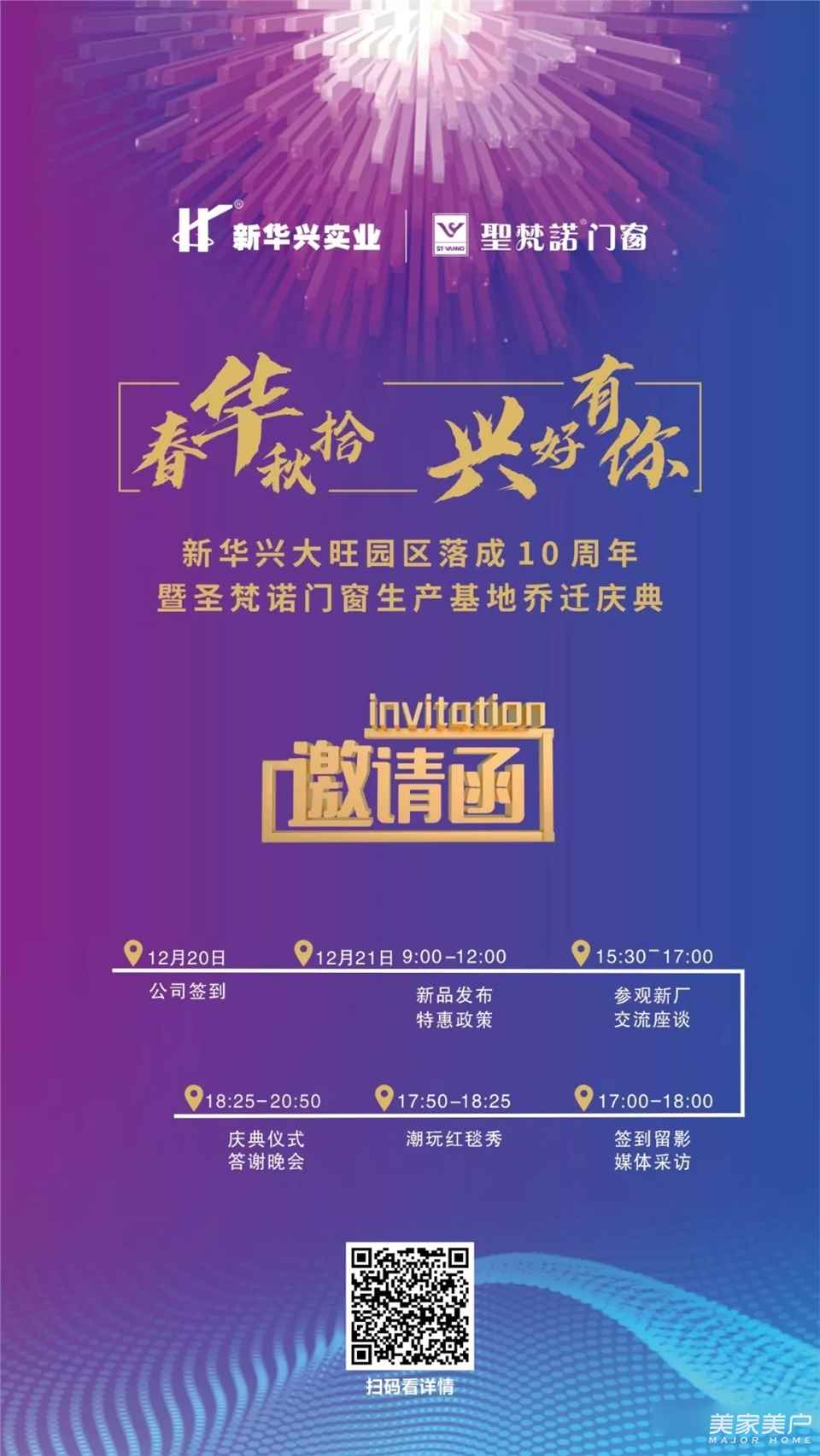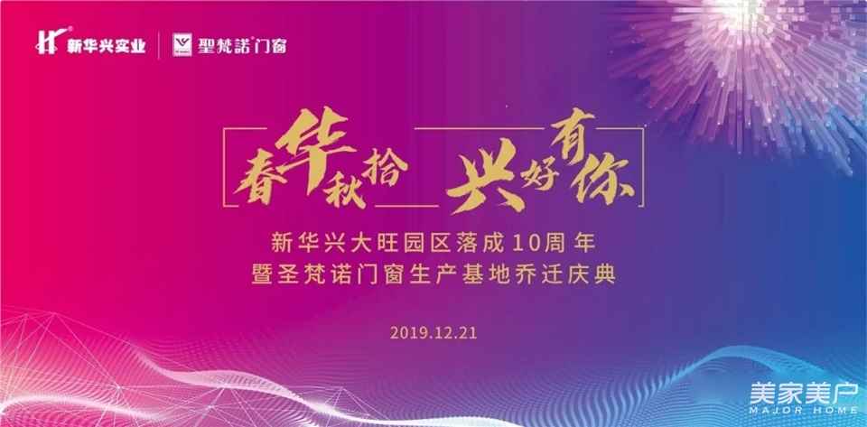 十年携手创新!十载春华秋实!十年同心共兴!新基地!新征程!新华章!春华秋拾,兴好有你!为感谢各级领导、家人、伙伴、朋友们一直以来的支持与厚爱,谨定于2019年12月21日下午,在肇庆四会大旺高新区新华兴园区内,举行“新华兴大旺园区落成10周年暨圣梵诺门窗生产基地乔迁庆典”。一路走来,有你真好!诚邀您拨冗莅临,让我们一道齐欢聚、共华庆、同创兴!内圣外王,共创辉煌!谨此奉邀!