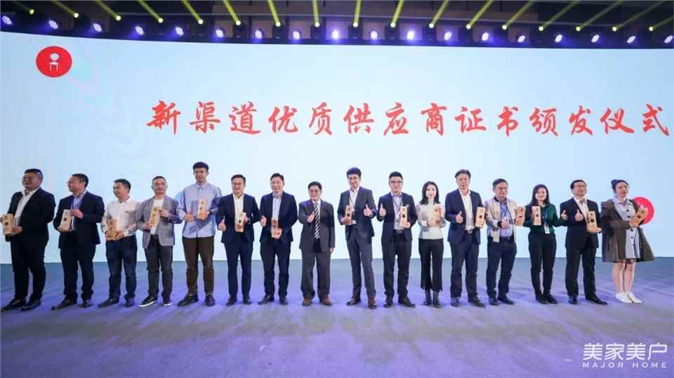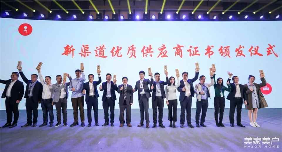新渠道优质供应商奖杯颁发仪式。广东省地产商会执行会长兼秘书长黄朝辉,亚厦装饰设计研究院第五院院长单鸿斌为获奖企业颁奖。