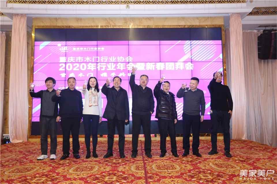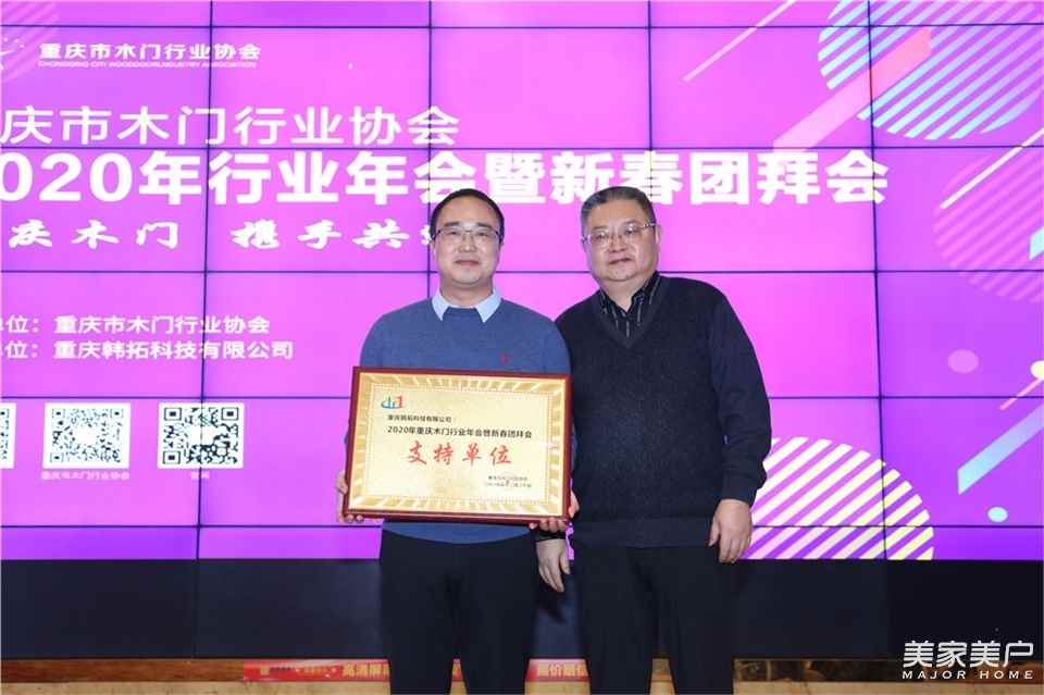 在年会和团拜会上,协会会长刘晓俊在会上致辞,协会秘书长梁天顺就2020年协会工作计划实施意见作了讲话,并对协会历史、目前现状、未来发展作了简单分析,协会会长刘晓俊向支持单位重庆韩拓科技有限公司颁发了奖牌,韩拓副总经理罗通在会上发表了讲话,星星和美心家美及固豪各自献上了歌舞,活跃了会议气氛。重庆作为全国最大的木门生产基地,在协会看实情、讲实话、办实事的务实办会思路下,形成行业独特风格,打响了重庆木门在全国的名片,成为名符其实的“中国套装门之都”。