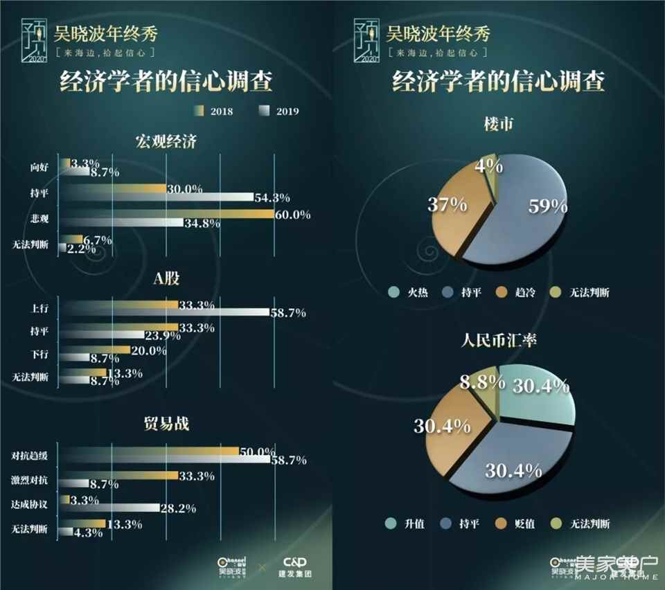 宏观经济层面。去年60%的经济学者对经济是悲观的,今年这个人数已经减少到了34%。而认为经济会持平发展的人由30%增加到了54%,也就是说这批经济学者普遍认为2020年的经济会比2019年稍稍好一点。