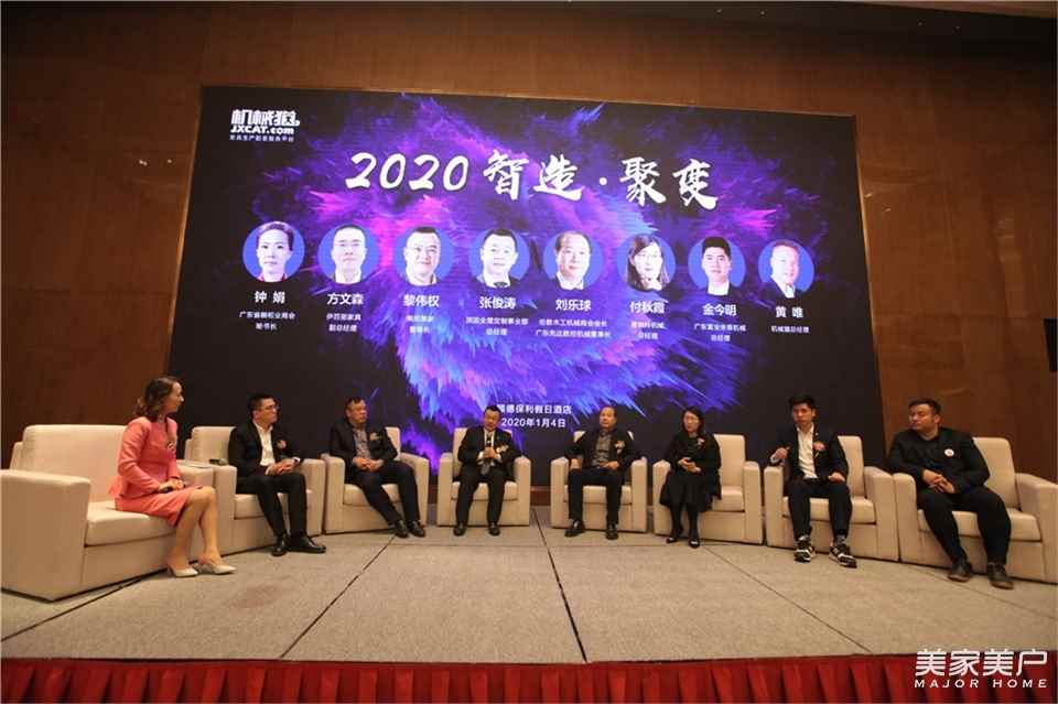 在论坛对话环节中,广东省橱柜业商会秘书长钟娟,顶固全屋定制事业部总经理张俊涛,美尼美家具董事长黎伟权,伊百丽家具副总经理方文森,伦教木工机械商会商会会长刘乐球,佛山市顺德区普瑞特机械制造有限公司总经理付秋霞,广东富全来恩机械有限公司总经理金今明,机械猫总经理黄唯等8位领导嘉宾以“2020智造,聚变”为主题共同探讨行业未来发展路线。