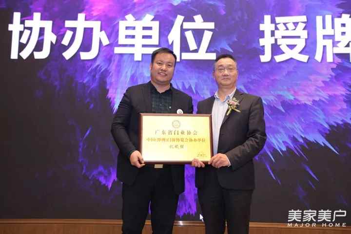论坛环节结束,晚会在经过短暂的休息后,广东省门业协会秘书长徐生上台作了2020年3月中国(潭州)门窗博览会的介绍,并作为颁奖嘉宾,为协办单位机械猫总经理黄唯颁发了中国(潭州)门窗博览会协办单位的奖牌。
