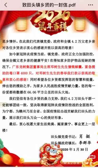 日益严峻的疫情牵动着全国人民的心,木门企业作为社会的一份子也积极参与到防疫救灾的行列中。近日,广东龙树集团董事局主席邓树生先生在得知家乡防护物品短缺的情况后,慷慨解囊,向田头镇紧急捐赠防毒口罩4000只。同时,邓树生还向赣州红十字会和宁都县捐赠医用口罩共计8000个。