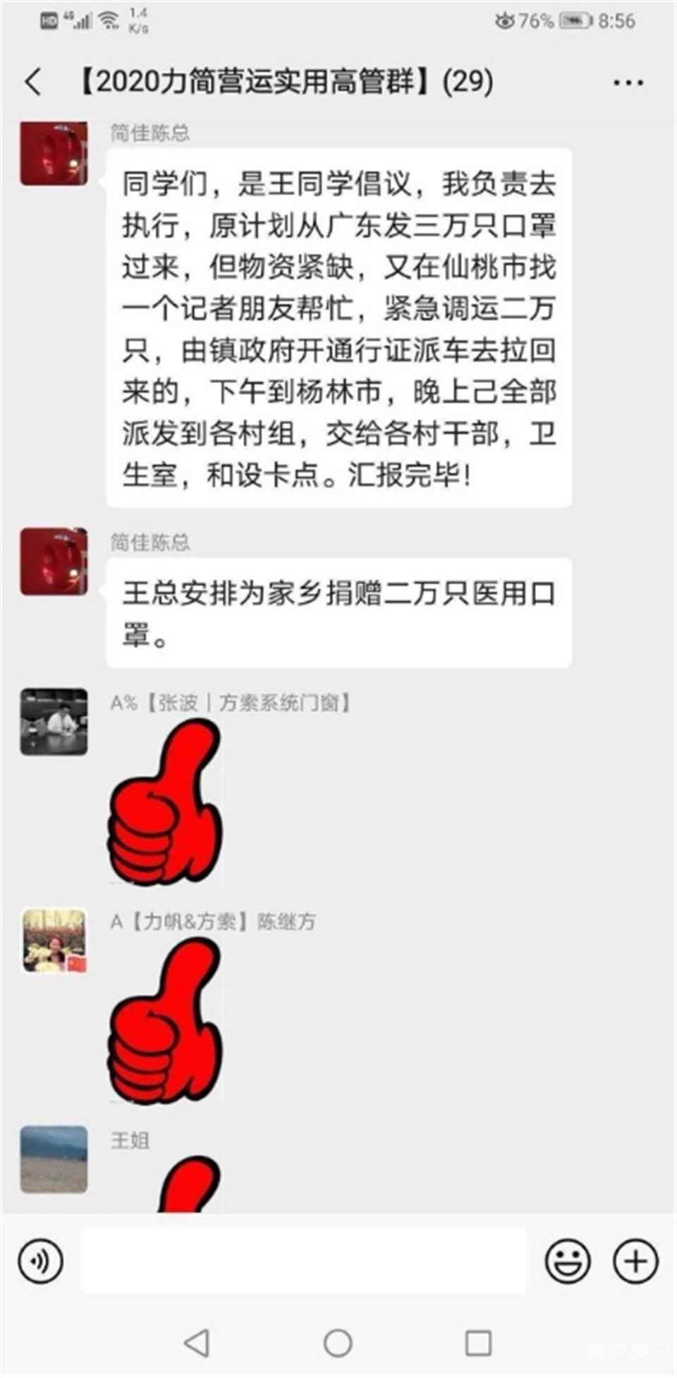 ▲方索门窗•力帆铝业董事长王承孝向家乡杨林市镇捐赠医用口罩20000个