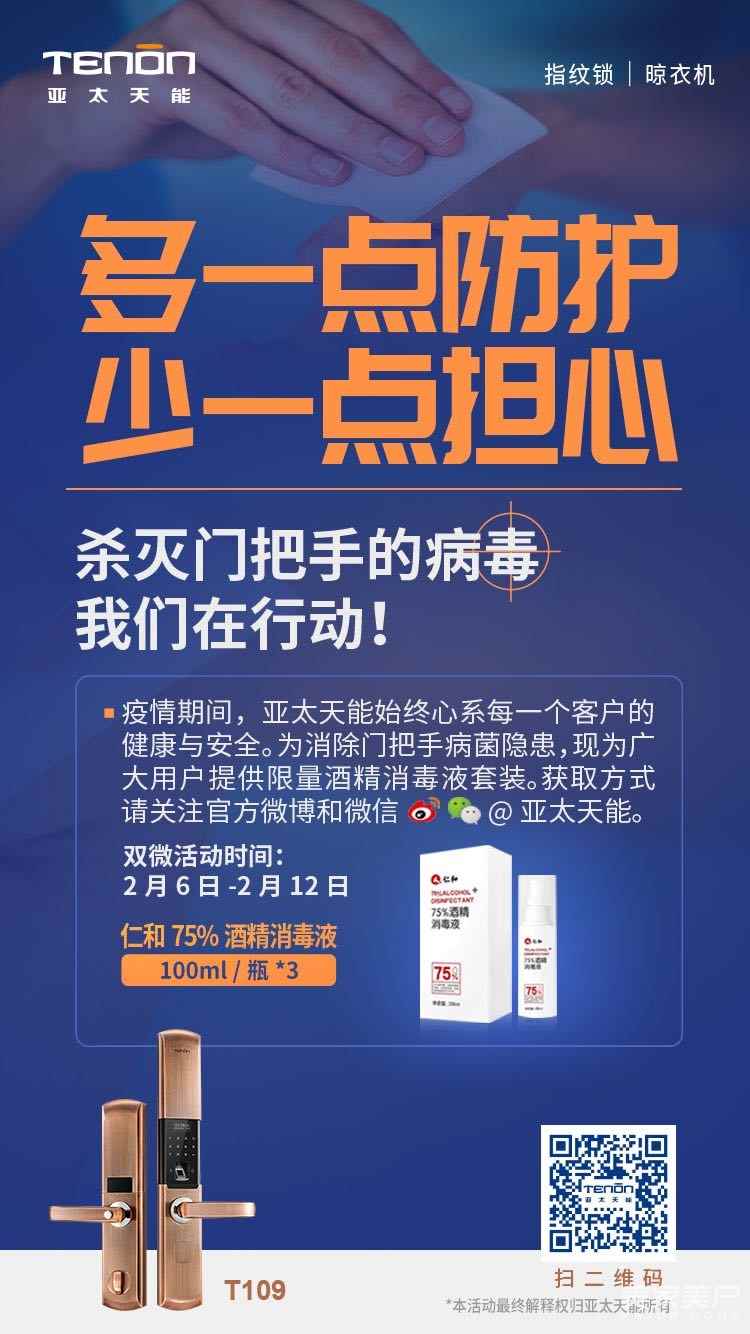 为此,亚太天能发起了“多一点防护,少一点担心”活动,向广大用户征集给武汉的暖心寄语。同时紧急调配消毒物资,将300余瓶酒精消毒液作为爱心礼品免费赠送,希望帮助用户开展家庭预防性消毒措施。