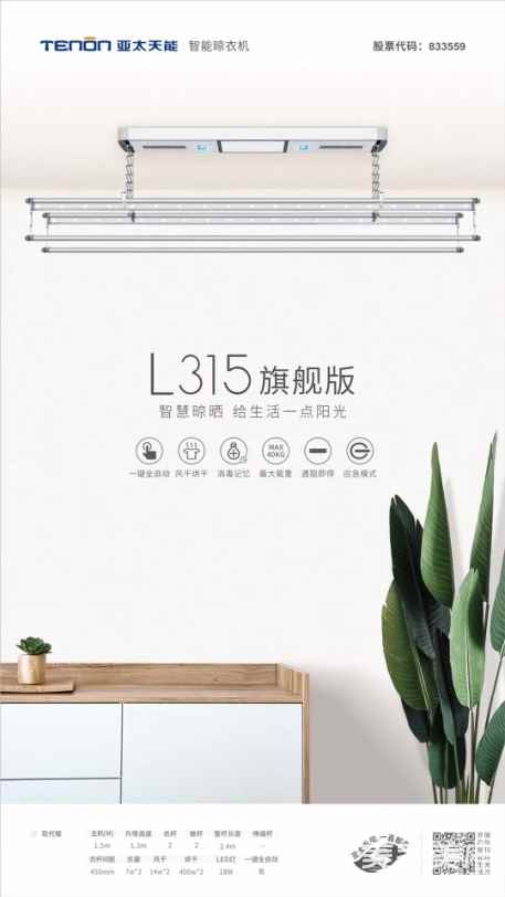 亚太天能智能晾衣机具备紫外线杀菌消毒功能,可通过自身紫外线消毒灯,破坏微生物的DNA结构,使之失去繁殖和自我复制功能,从而达到有效的消毒效果。