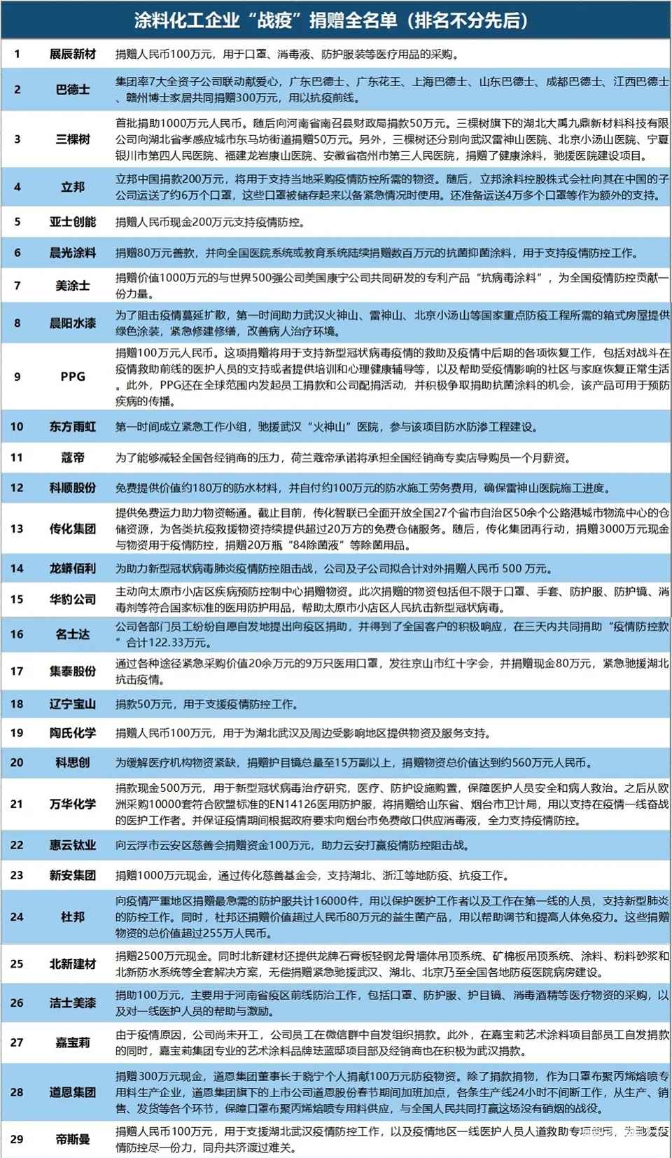 涂料化工企业“战疫”捐赠全名单公布