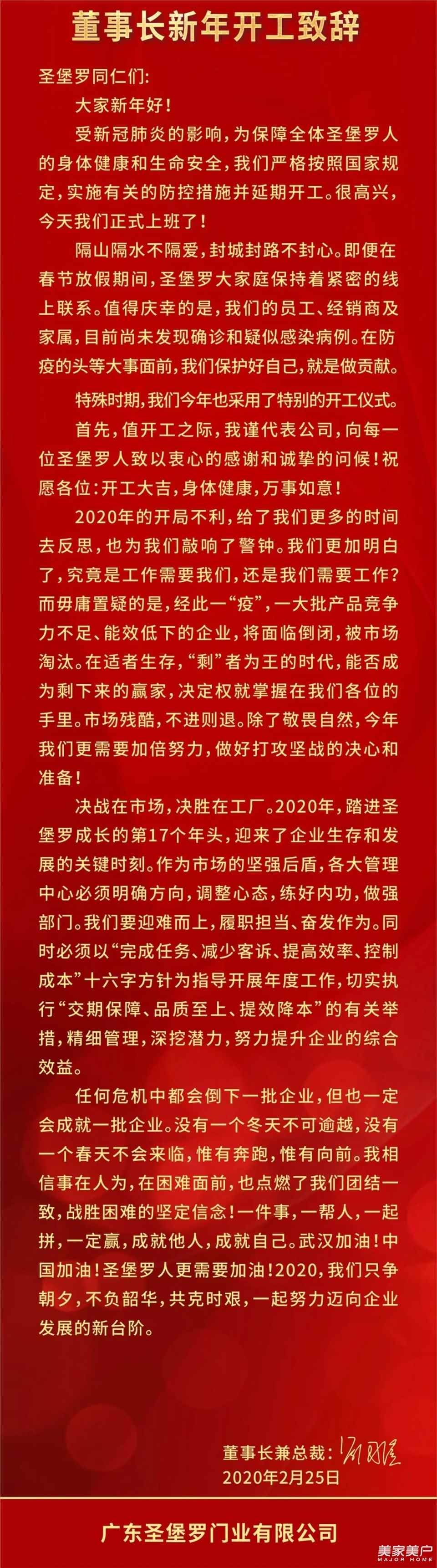 正如吴董所说,任何危机中都会倒下一批企业,但也一定会成就一批企业。在困难面前,也点燃了我们圣堡罗人团结一致,战胜困难的坚定信念!决战2020,一起加油!