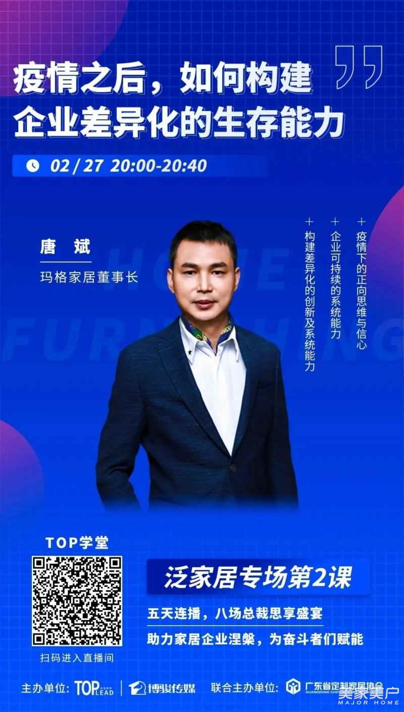 2月27日晚,玛格家居董事长唐斌开启公益第2讲——“疫情之后,如何构建企业差异化的生存能力”,围绕课程核心观点整理如下: