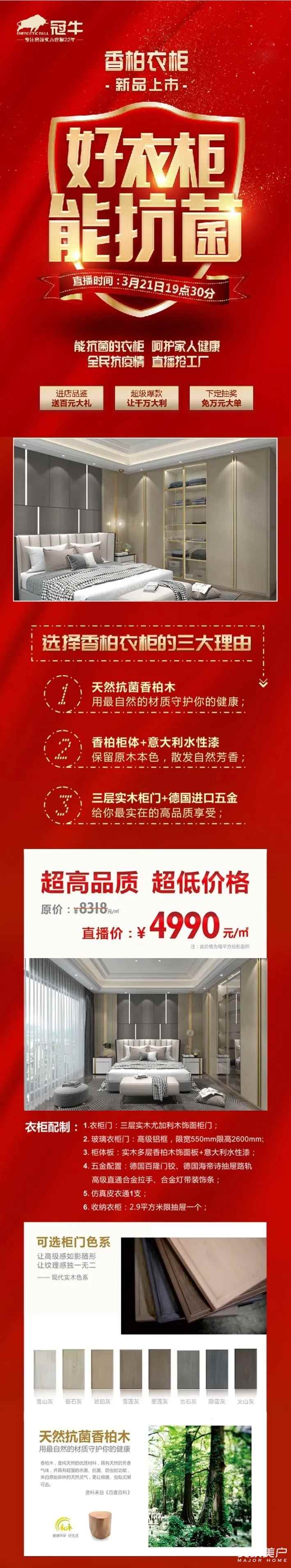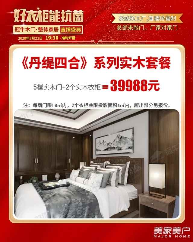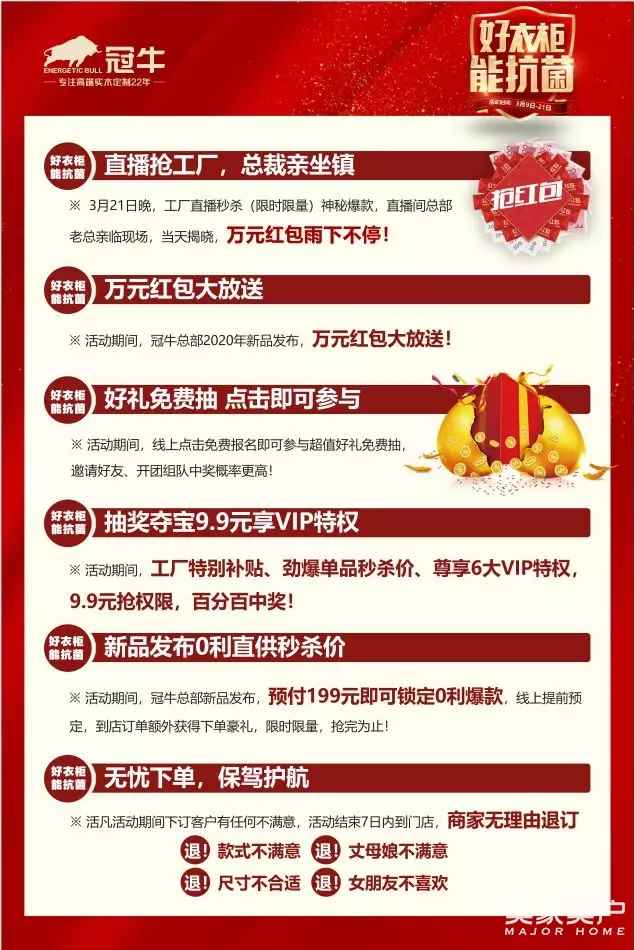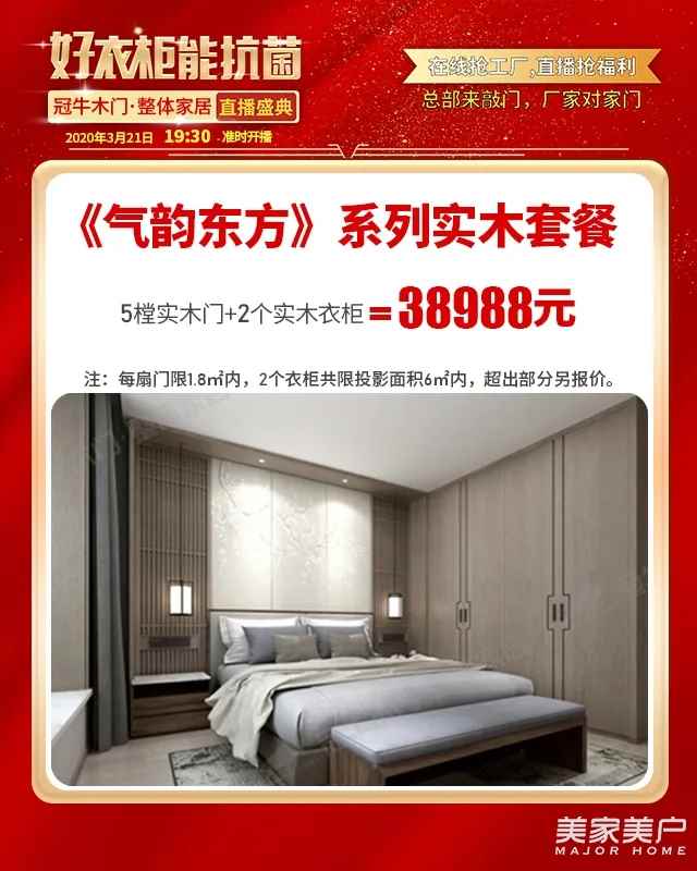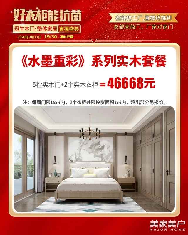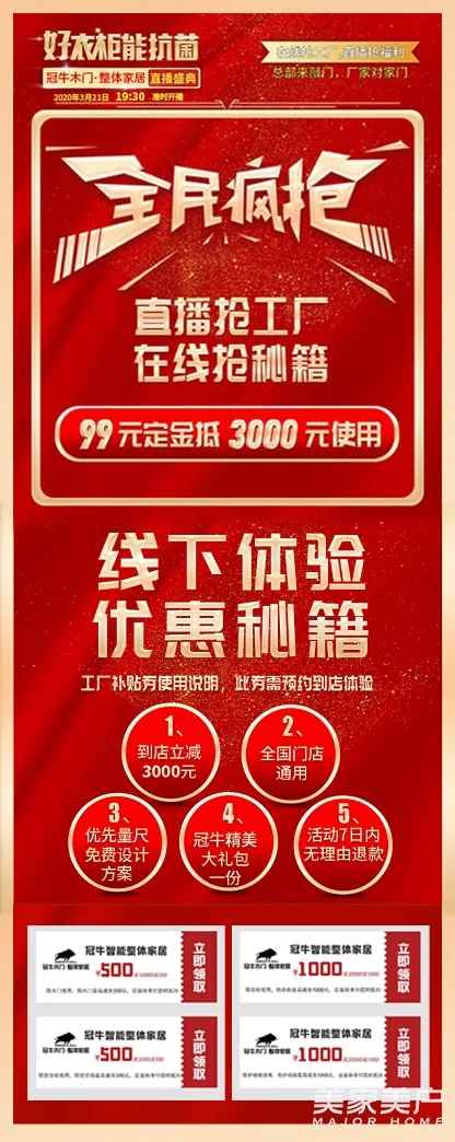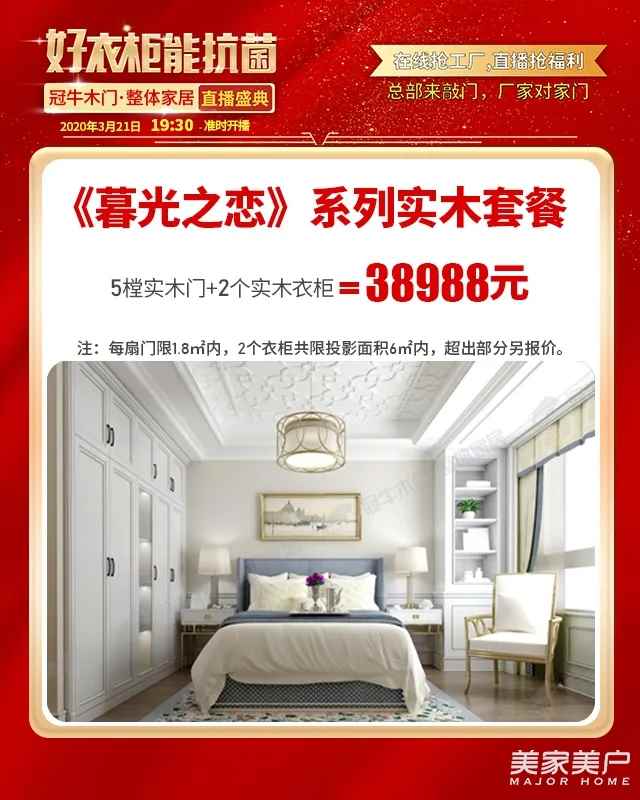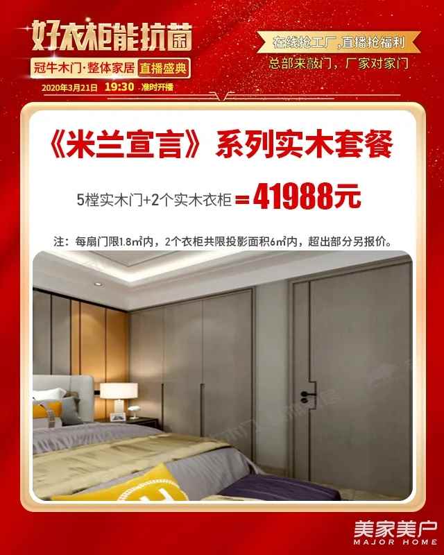 为了满足广大消费者的装修需求,冠牛木门·整体家居将于3月21日19点30分举办线上直播抢工厂活动,为广大消费者准备了一大波福利,不仅有针对这次疫情推出的能抗菌的新品衣柜“香柏衣柜”、秒杀特价门和简时代五大实木优惠套餐产品,还有万元红包和丰富的礼品等等,真正做到让消费者“足不出户抢工厂”。