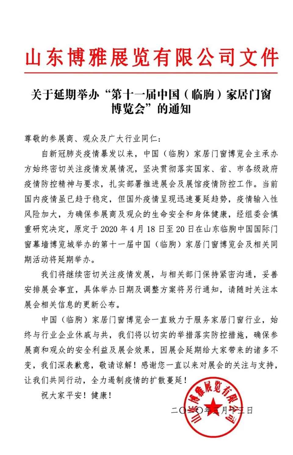 根据国内外新冠肺炎疫情防控需要,为响应国家号召及相关政策要求,切实保障参展商和观众的身体健康和生命安全,经中国(临朐)家居门窗博览会组委会慎重研究决定,原定于2020年4月18日至20日在山东临朐中国国际门窗幕墙博览城举办的第十一届中国(临朐)家居门窗博览会及同期相关活动将延期举办。通知全文如下