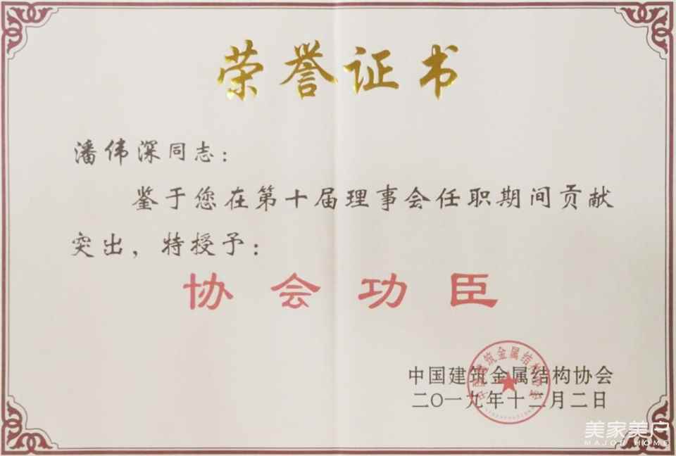 根据中国建筑金属结构协会“关于评选优秀会员单位和先进个人的通知”的要求,经民主推荐、公开征求意见、评选领导小组审定,最终评出潘伟深等19位同志为“第十届理事会协会功臣”,是铝型材行业唯一荣获此荣誉的功勋人物。