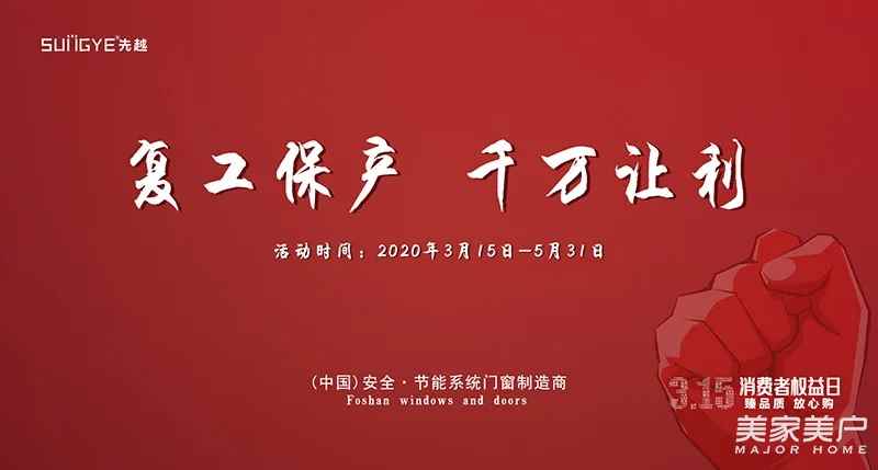 一年一度的3.15国际消费者权益日如期的到来。然而,突如其来一场疫情使得今年的“3.15”多了一层特别含义。各行各业都受到了不小的冲击,延迟复工也使得各行各业异常艰难,门窗建材行业也不例外。正如标题所示“复工保产”也是各行各业行业的真实写照,在这特殊的3.15,先越门窗除了高力度的折扣活动回馈消费者共度难关外,更是将品质这张与众不同的王牌全盘亮出。