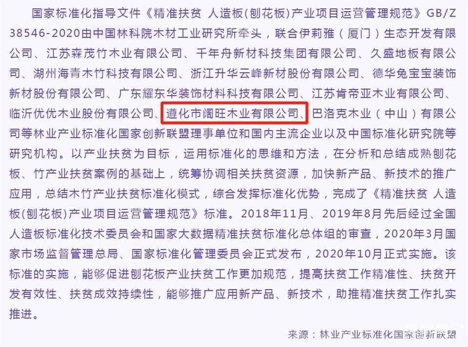 根据国家市场监督管理总局、国家标准化管理委员会发布的中国国家标准公告2020年第1号,国家标准化指导文件《精准扶贫 人造板(刨花板)产业项目运营管理规范》GB/Z 38546-2020正式发布。遵化市阔旺木业有限公司参与其中。