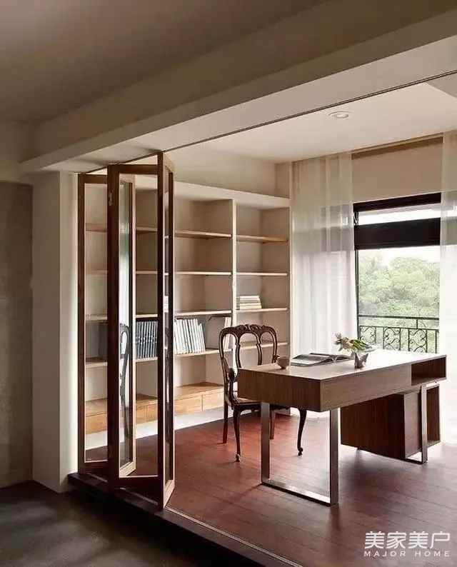 一款折叠门,便可实现这样的生活。对于小户型的房子来说,可将阳台改造成书房,与客厅交接,用折叠门相隔。开启时,把书房空间纳入到公共区域,让客厅空间显得更加宽敞,关闭时,这里就是自己的小小世界,抬头便是那璀璨的星空。