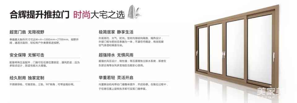 合辉提升推拉门,采用进口五金,推拉自然流畅,静音减噪,经久耐用;超宽门扇,视野开阔,美观时尚;有手动及电动两款,可根据需求进行选择。