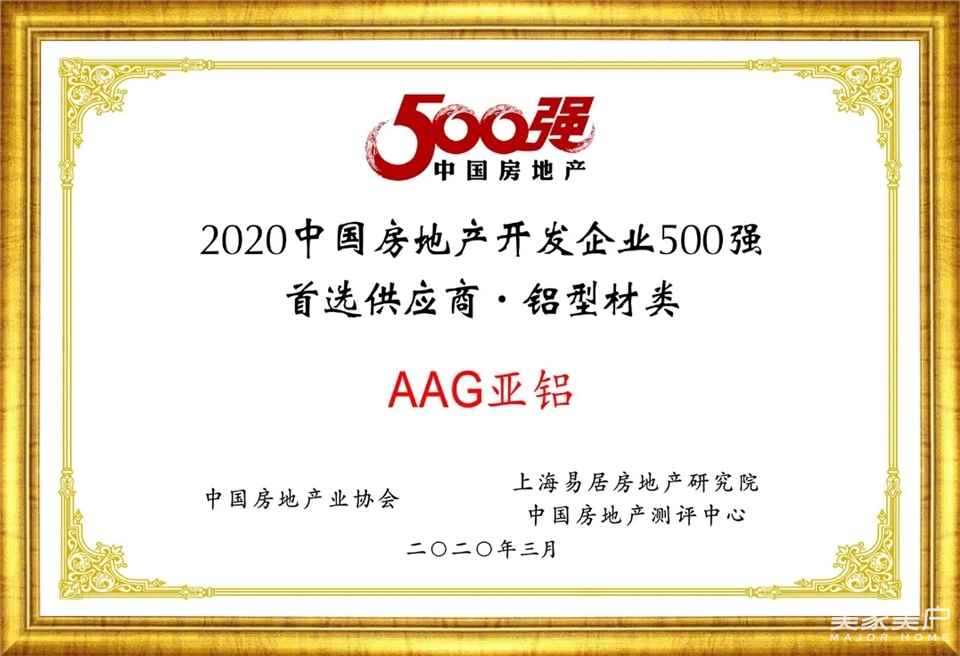揭晓!AAG亚铝蝉联“2020年中国房地产开发企业500强•首选型材供应商