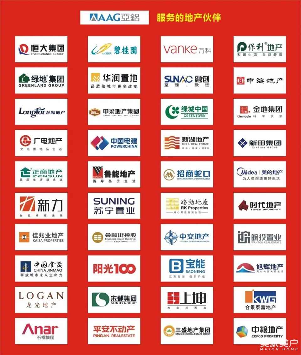 2019年,AAG亚铝凭借领先的综合实力,与百强地产广泛开展了业务往来,分别与恒大、碧桂园、保利、华润、绿地等全国百强房地产企业建立了战略合作关系,并成功进入了40余家国内知名房地产合同采购铝材品牌库。