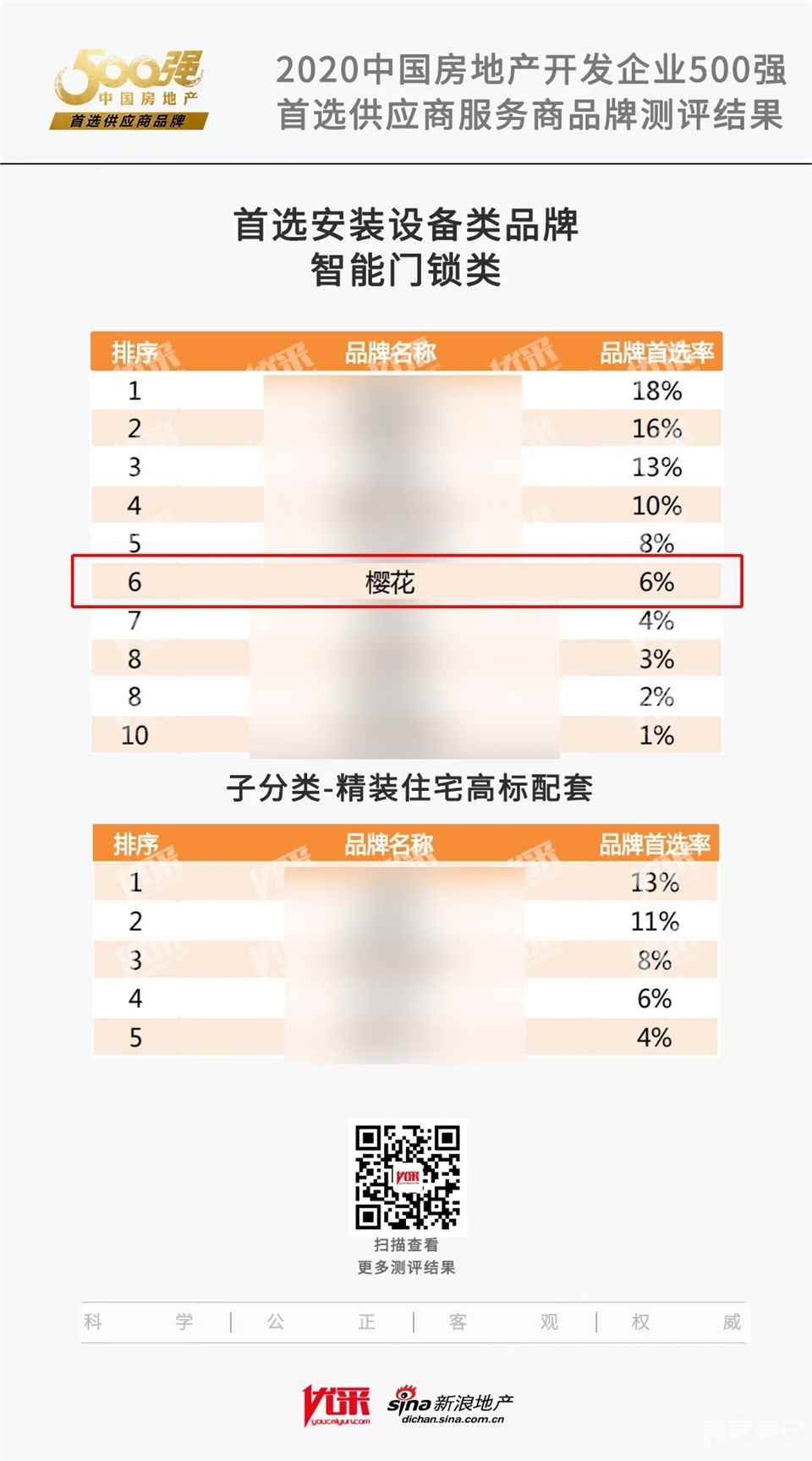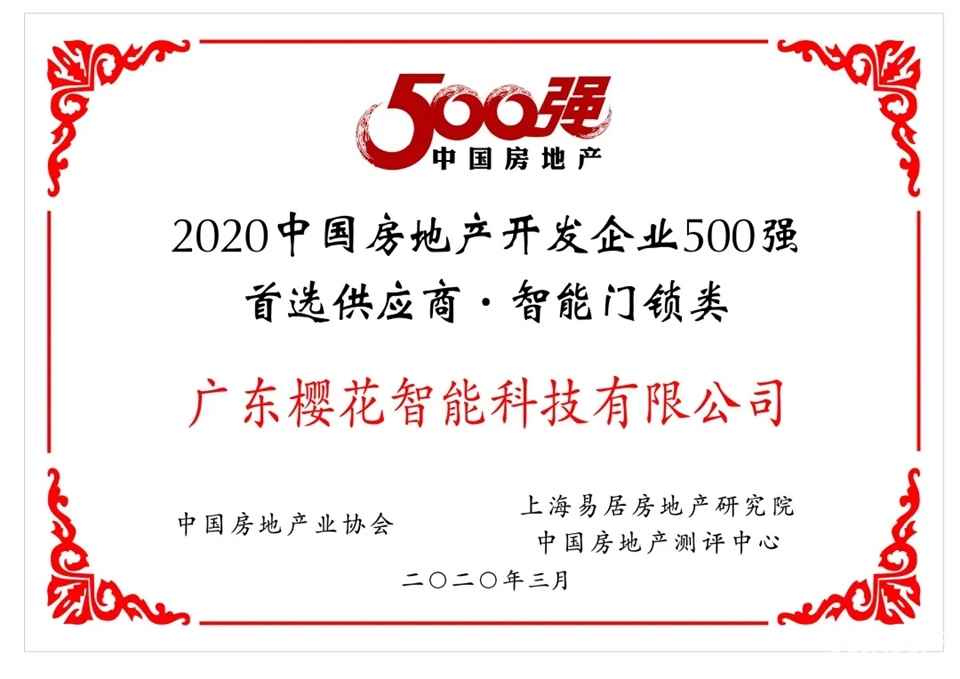 本次峰会上,《2020中国房地产开发企业500强测评报告》和《2020中国房地产开发企业500强首选供应商服务商品牌测评报告》同时揭晓。测评报告显示,广东樱花智能科技有限公司荣获2020年中国房地产开发企业500强首选供应商服务商品牌测评榜单的智能门锁类10强。