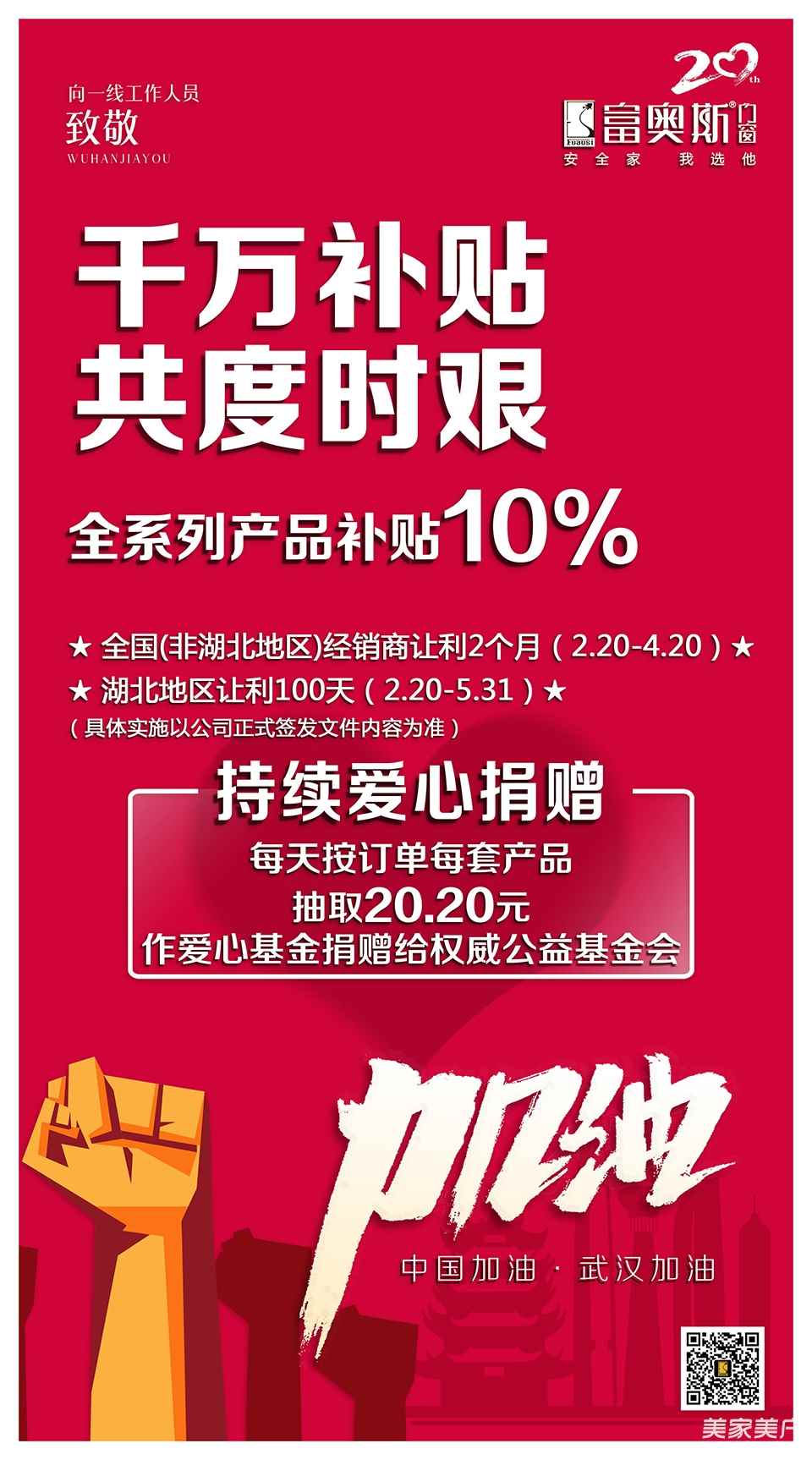 针对这次疫情,富奥斯门窗快速反映,在积极响应政府号召捐款捐物的同时,给经销商合作伙伴也出台了“千万补助,共克时艰”的补贴政策。全国(非湖北地区)全系列产品下浮10%让利支持2个月,湖北地区全系列产品下浮10%让利支持100天;同时为不断的传递爱心,公司每天的订单再按20.20元/套,捐赠给权威公益基金会。