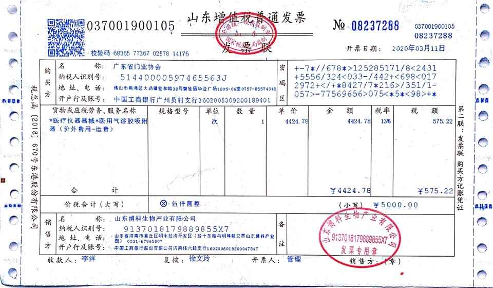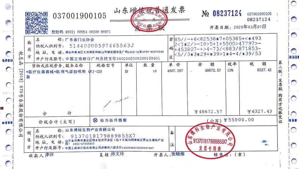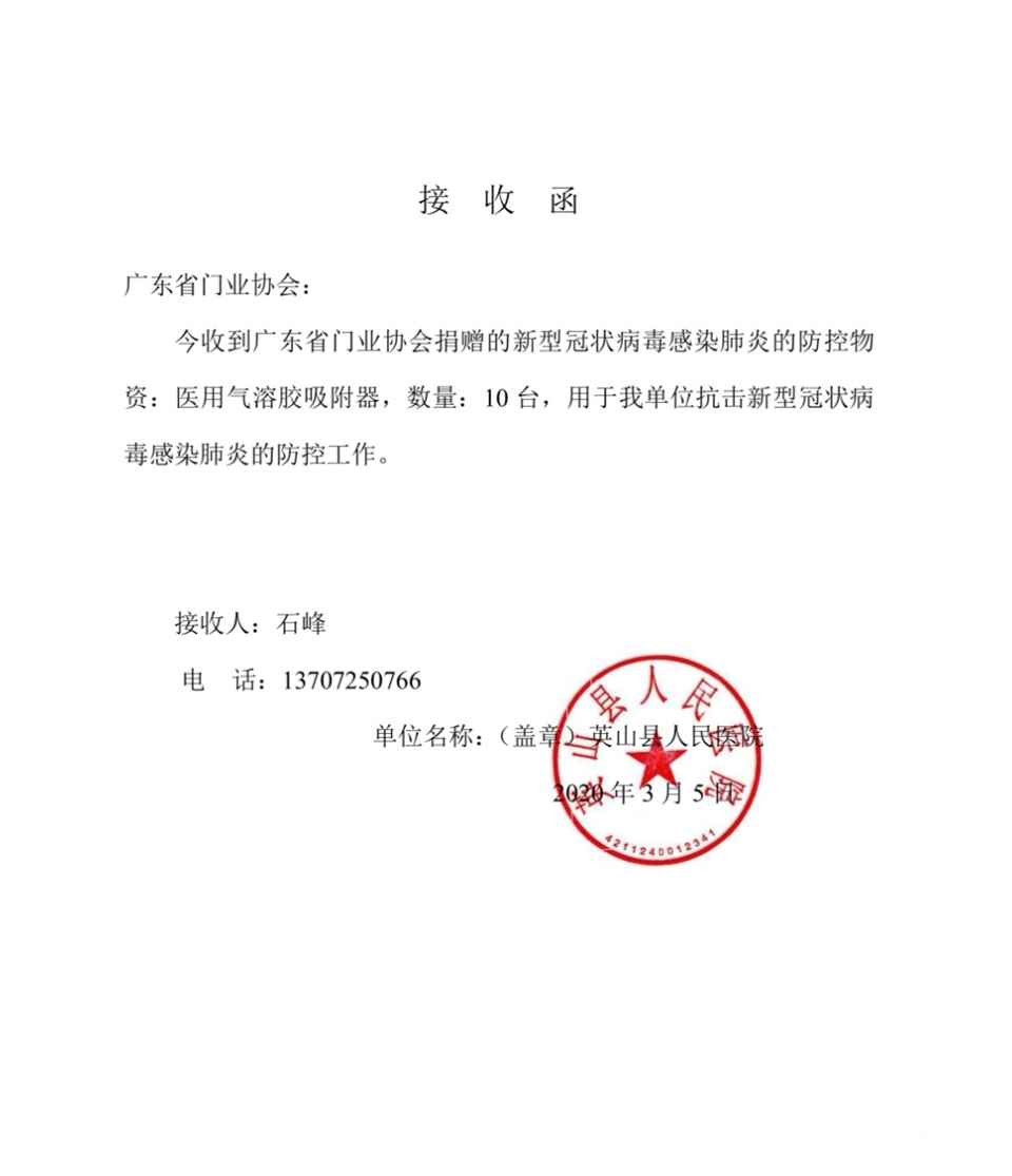 募捐第二笔捐赠物资费用57500元,已联系到山东博科生物产业有限公司,采购医用气溶胶吸附器10台,总额55000元,另外运费2500元,共合计57500元物资。目前第二批抗疫物资(10台医用气溶胶吸附器)已发往湖北黄冈英山县人民医院并已签收。