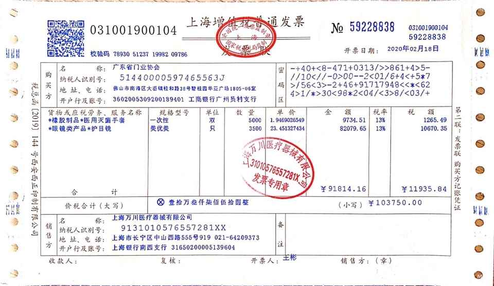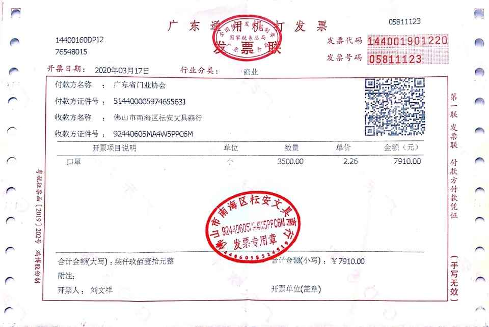 此外,除以上三笔款项外,剩余款项7910元已购买一次性防护口罩3500个,每个2.26元,用于湖北省门业协会、广东省门业协会抗疫专用。
