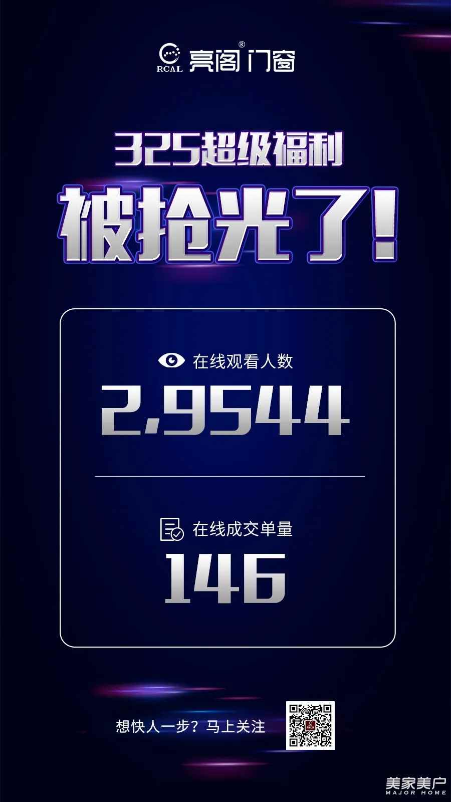 此次325超级直播活动,亮阁全国各地的经销商将业主们聚集在线上直播间,让业主花小钱买好产品。这次直播吸引了近三万的粉丝进入直播间秒杀,千万福利被瞬间抢光了。