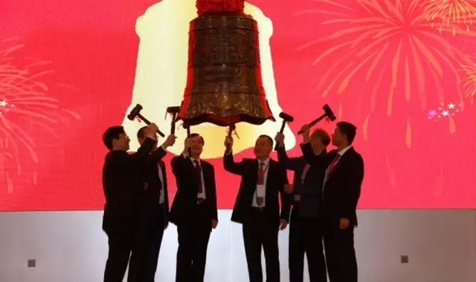 董事长兼总裁白宝鲲在仪式上作了致辞发言,总结过去、展望未来,并邀请中国建筑装饰协会会长李秉仁、中国建筑金属结构协会会长郝际平上台共同敲钟开市。