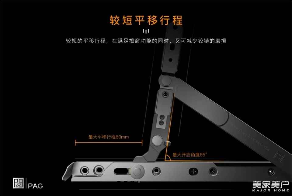经过考究调校,铰链开启行程设计为80mm,做到短行程、大开启。较短的平移行程,可有效减少铰链连接件因长距离移动造成的磨损,且不会影响日常窗户的清洁擦洗。
