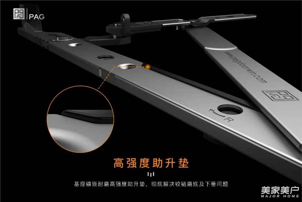 铰链基座镶嵌耐磨高强度助升塑胶垫,胶垫采用微抬高设计,彻底解决了铰链启闭时的磨底及下垂问题。助升功能使得窗扇开启更顺畅,静音效果更佳。