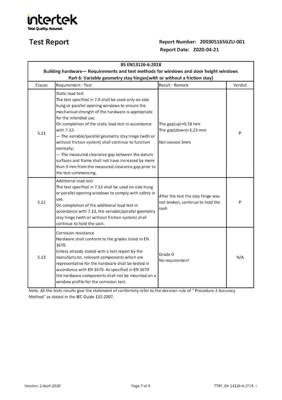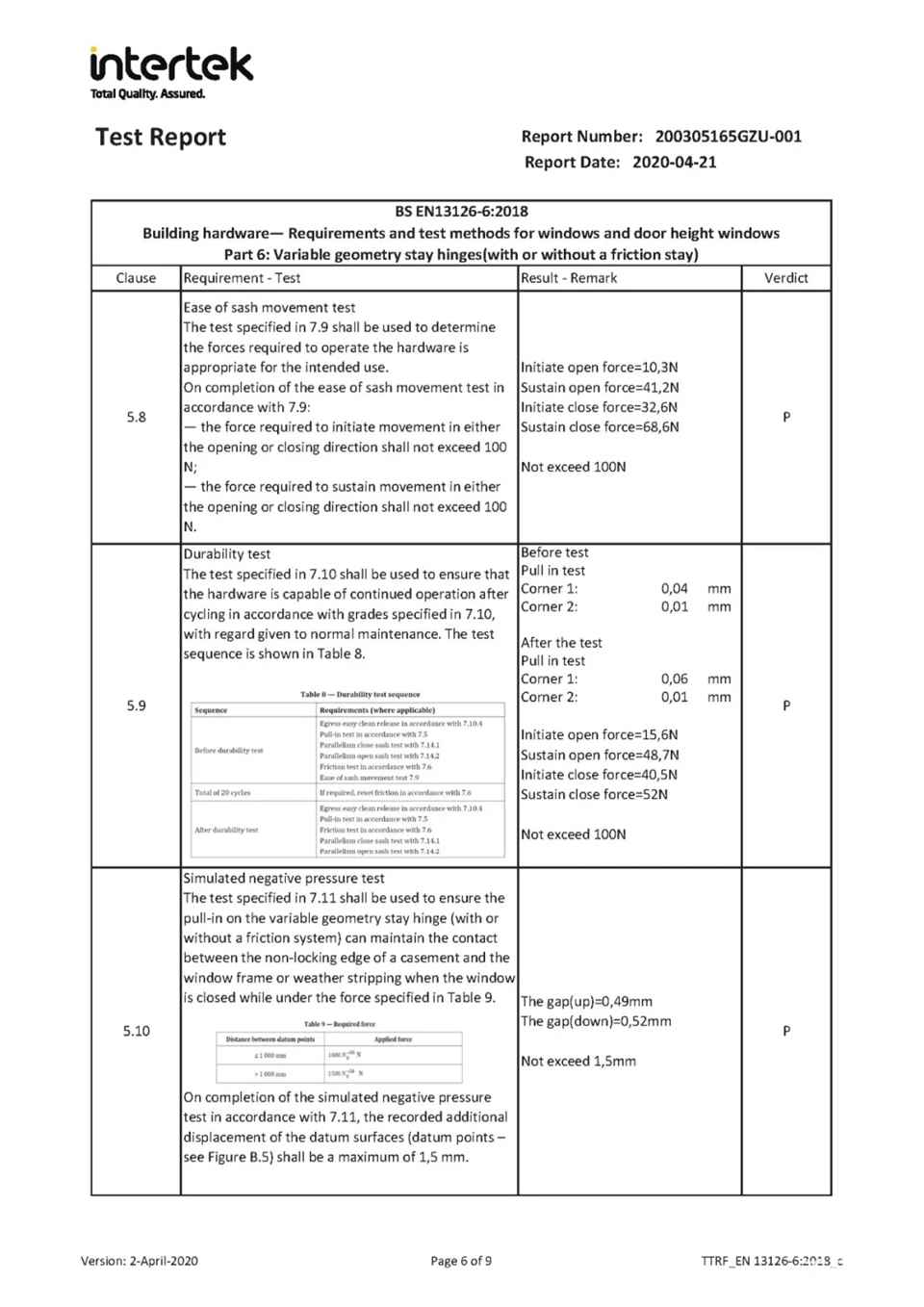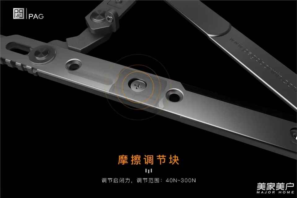 独有的摩擦调节块设计,可通过调节摩擦块螺丝的松紧度,实现窗扇的启闭力的自主调节,调节力度为40N~300N,铰链可于任意点停顿,保证铰链承受力与窗扇协调性到达完美状态,整窗协调性能高,更为稳固安全。