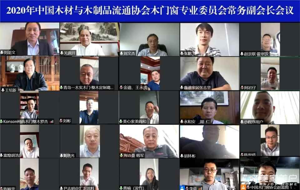 2020年5月28日,中国木材与木制品流通协会木门窗专业委员会在线上组织召开了年度第一次常务副会长视频会议。中国木材与木制品流通协会会长刘能文,副会长兼秘书长李佳峰,常务副秘书长刘文杰,木门窗专业委员会会长、广东润成创展木业有限公司董事长关润开,北京闼闼同创工贸有限公司副总经理张岩,浙江金迪门业有限公司董事长王永虎,山东万家园木业有限公司总经理王绍新,黑龙江三和木业(集团)有限公司董事长胡林彬,北京霍尔茨门业股份有限公司总经理赵崇联,北京伯艺创展木业有限公司董事长王显,湖北永和安门业有限公司董事长周仁,山东鑫迪家居装饰有限公司总裁张志华,重庆美心集团副总裁、重庆美心家美木业有限公司总经理阎和,青岛一木实木门有限公司董事长葛炳江,青岛彬城木业有限公司董事长刘彬,湖北柯尚木业有限公司董事长罗杰,秦皇岛和玺木业有限公司董事长刘晓光,安徽富煌木业有限公司总经理胡浩然,山东洪涛艺创科技股份有限公司总经理陈毓华,福建省长胜整木家居有限公司副总经理陈世侨,中山市海诗蔓五金有限公司董事长韩军,广东汇龙涂料有限公司副总经理尹志明,木门窗专委会秘书长黄楠,副秘书长李卓,市场部主任赵蓝图等近三十人参加会议。会议由木门窗专业委员会常务副会长张鹏主持。