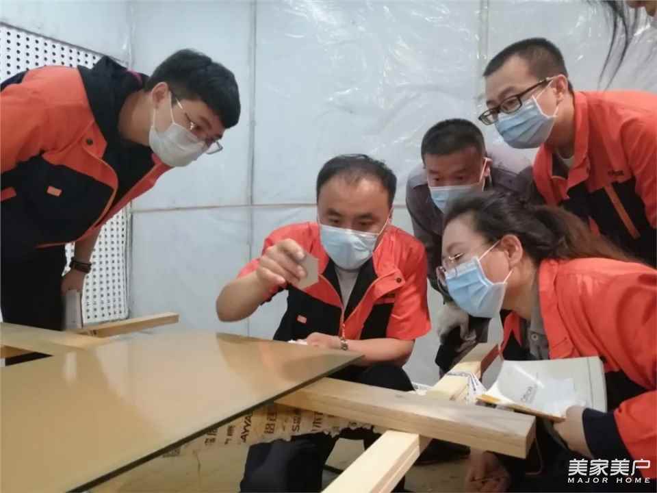 △ 木窗二部经理张海军、品质部经理李婷婷等对漆膜厚度进行检验