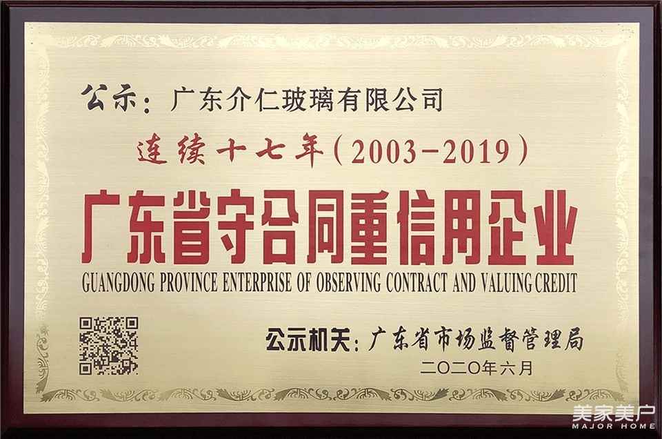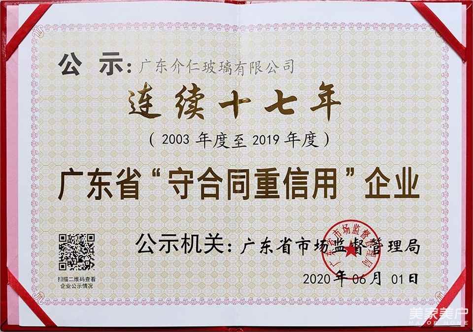 2020年6月1日,广东省市场监督管理局对2019年度广东省“守合同重信用企业”进行第一批公示,介仁艺术门窗凭借良好的市场信誉和优质的产品服务,顺利通过市场监管部门的最终评审,并获相应的荣誉牌匾和荣誉证书。