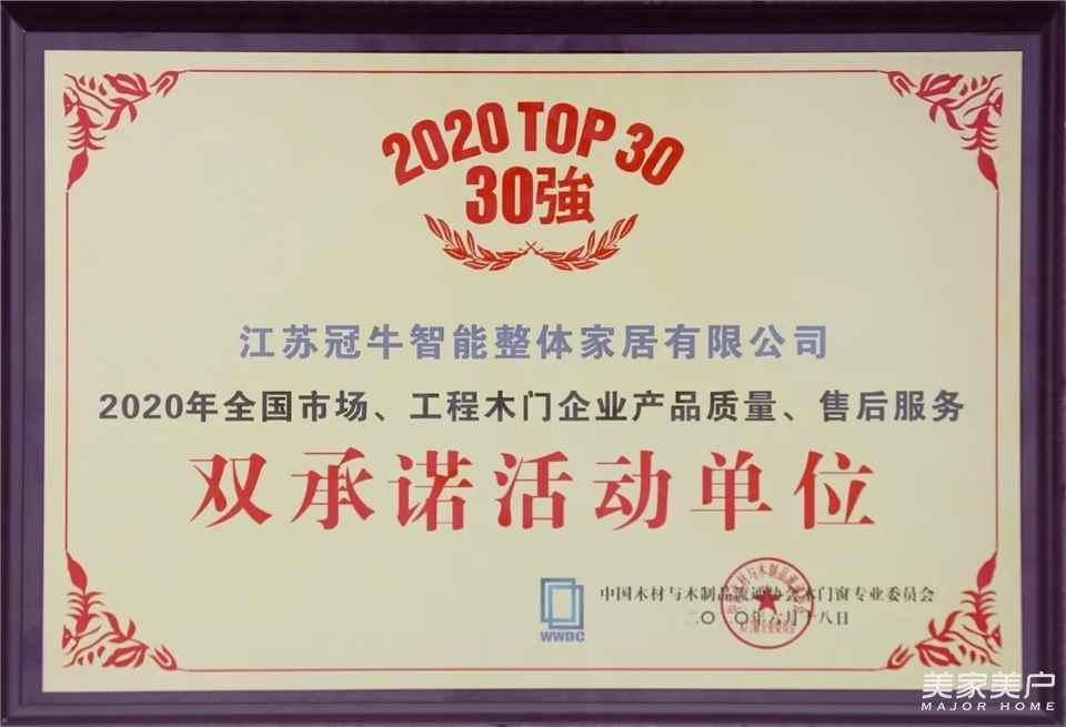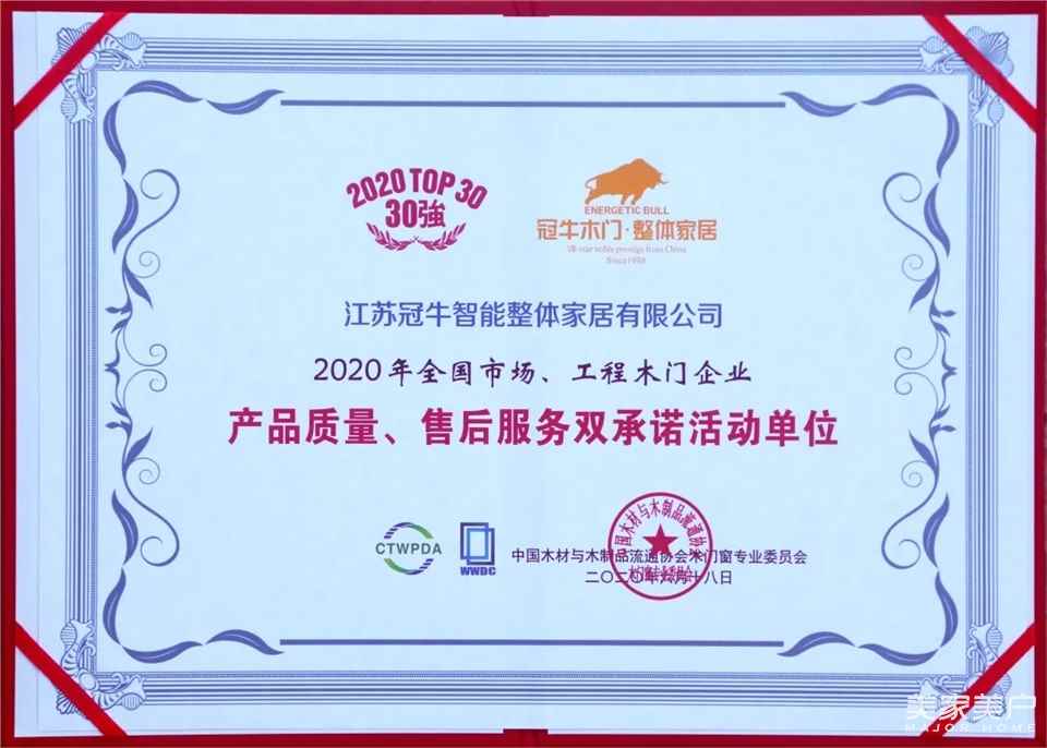 冠牛木门·整体家居荣获“2020年全国市场、工程木门企业产品质量、售后服务双承诺活动单位”。这是行业对冠牛的高端品质与匠心服务等方面充分的肯定,也是对冠牛20余年来在实木领域的领导地位体现。