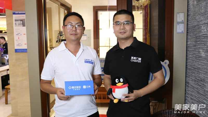 ▲其邦门窗长沙专卖店总经理肖勇(右)与腾讯家居·门窗频道运营总监杜锋