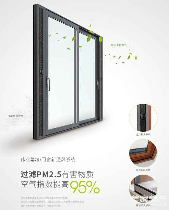 伟业门窗新风系统,不开窗也能实现居室健康通风和静音的需求,空气过滤净化等。过滤网作为新风系统的第一道防线,过滤PM2.5的效能达98.5%,可以免受雾霾天气的伤害!雾霾天也能隔绝有害物质,保持室内密闭情况下亦能享受新鲜空气。