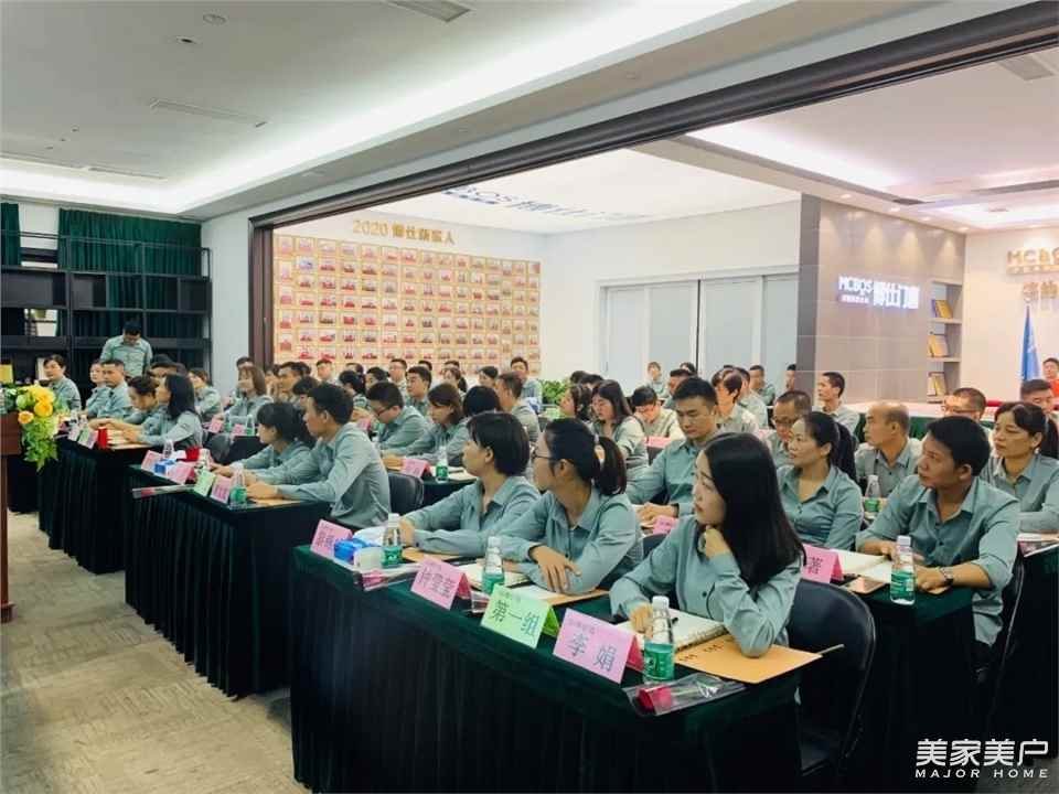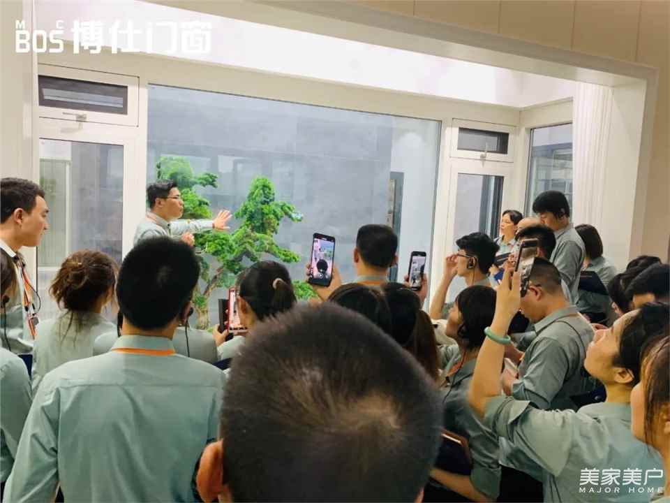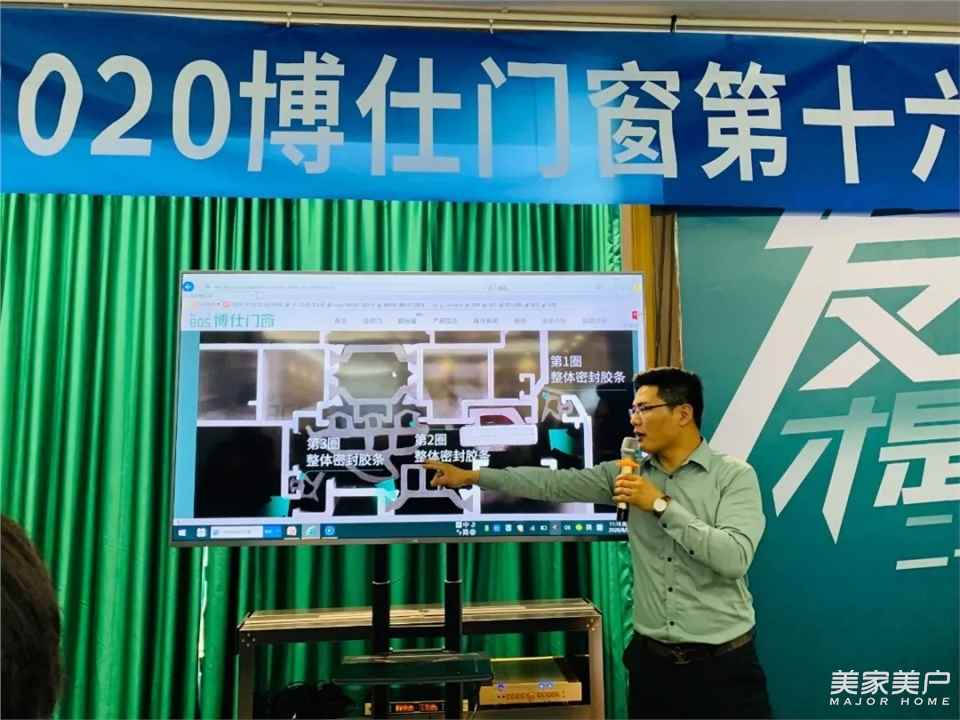 根总致辞结束后,由市场部谢校辉在会议室为学员们讲解如何介绍博仕门窗的产品;下午继续带领学员在车间和展厅进行现场演练。