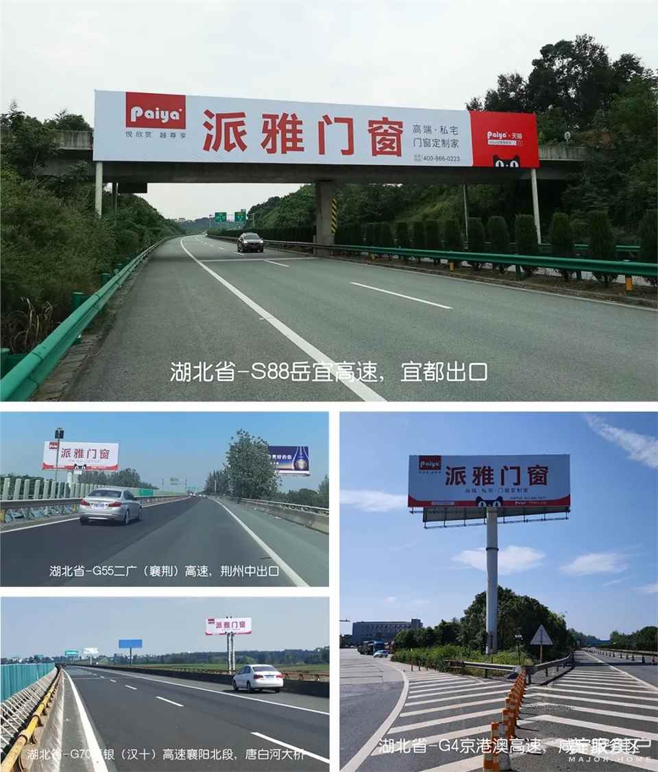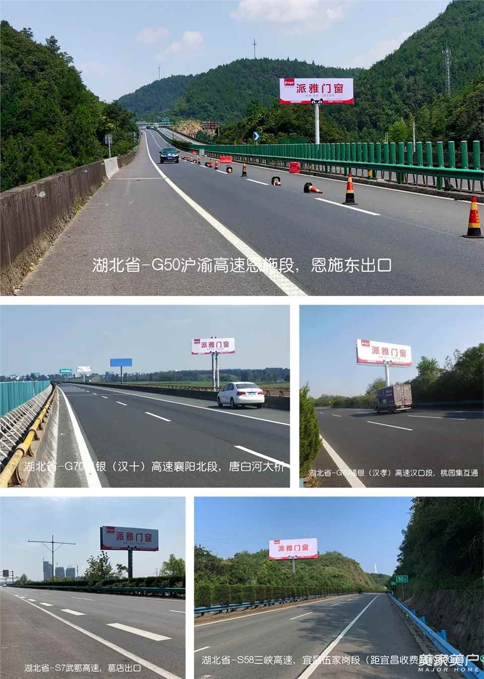 此次派雅高炮广告投放以湖北省为核心,对全国重点地区进行针对性投放。截止目前,派雅高炮广告已覆盖京港澳高速、沪渝高速、福银高速、二广高速、汉孝高速、汉十高速、沪武高速、武鄂高速、三峡高速、岳宜高速等多条高速路段,以湖北为核心的波纹状传播矩阵持续霸屏,有效触达受众从而实现派雅品牌快速传播,为派雅强势发声,彰显派雅雄厚实力。此次派雅投入大手笔在湖北投放高炮广告,斥资千万抢占户外高速传播制高点,气派优雅的品牌广告受众人群不可计数,高密度的高速路线投放布局,一为响应国家号召,持续霸屏为中国疫情后复工复产而加油,支持湖北经济复苏,鼓励更多消费者恢复信心,尽显企业责任担当。同时,也是我们打响品牌的“大招”,也是派雅落实广告扶持、给经销商引流的有效措施,为经销商打下一剂“强心针”,实现区域化全渗透,高效传达品牌形象,并为渠道渗透提供了强有力的支持。