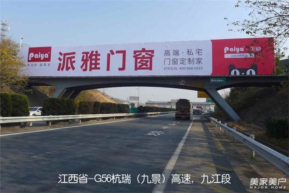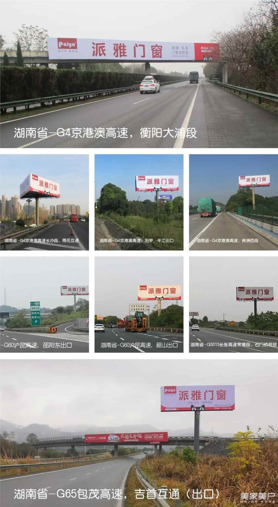 派雅门窗可谓大动作不断,不仅在营销策略上大胆创新,在品牌战略上展现中国门窗品牌风范,2019年,派雅于全国交通枢纽高铁上海虹桥、南京南、济南西,广州南、沈阳、南昌西、深圳北、长沙南、武汉和郑州东站十城联动传播、以及强势登陆成都双流机场、长沙黄花机场、武汉天河机场、南京禄口机场、石家庄正定机场、太原武宿机场六大国际机场联动启航,全面提升品牌知名度与市场占有率。今年5月,派雅门窗于南京站、济南西站、西安北站、长沙南站、郑州东站等全国重要交通干线与枢纽站大规模加大投放第三批高铁广告,以及湖南、福建、贵州、江西、湖北五大省份投放高速高炮广告同步启航;6月派雅门窗围绕中国最核心的高铁线网,发挥纵贯南北的京沪、京宁高铁的大动脉辐射作用,于苏州站、常州站、无锡站等区域核心城市站点投放第四批高铁广告!此番派雅在湖北各高速投放高炮广告,以路铁传媒为基石,充分利用群体受众面积大、传播快、定位准的优点,精准投放、有效触达从而实现派雅“匠心潮牌”品牌理念传达给万千旅客,实现中国品牌与中国速度的强强联合、交相辉映,将助力“派雅门窗”品牌建设占领更广阔的市场。
