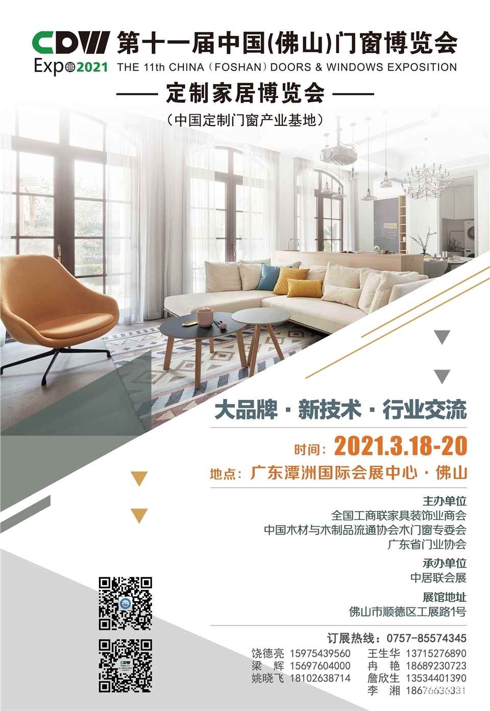 2021年3月18日,第11届中国(佛山)门窗博览会暨定制家居博览会,将在佛山(潭洲)国际会展中心盛大开幕,诚邀您的莅临