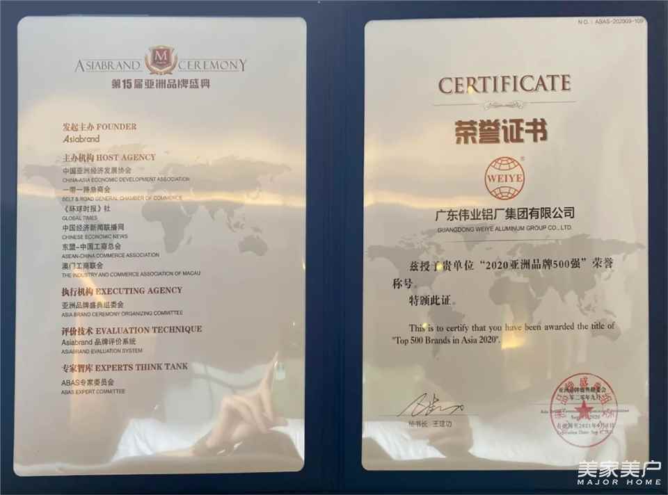 此次榜单由专业评价机构Asiabrand、中国亚洲经济发展协会品牌评价专业委员会、ABAS专家委员会联合推出,遵循“独立、客观、公正、科学”的行业标准,从八大维度22项指标对亚洲企业品牌进行全面性的测评,该榜单不仅仅可以窥见亚洲经济结构的变化以及各行业的发展趋势,而且为品牌学术研究、企业品牌管理、企业并购和金融投资提供科学参考数据。广东伟业铝厂集团有限公司凭借其优良的产品品质、深厚的品牌积淀,取得了铝型材行业的领导地位,六次蝉联“亚洲品牌500强”,以516.97品牌价值综合指数排在第298位,再次星耀亚洲。